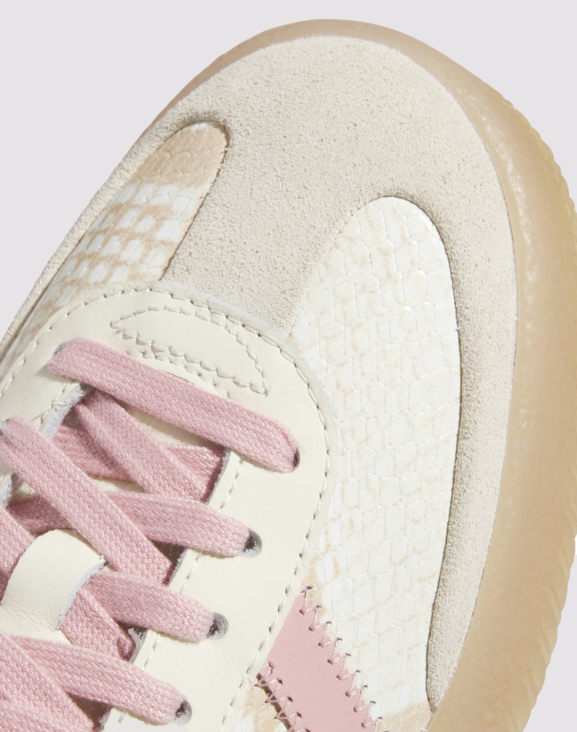 A luxe, elevated take on the legendary trainer, the adidas Originals Sambae "Cream White/Wonder Mauve" Women's Shoe refashions the iconic design with a shimmery metallic look. Made with textured, scale-like leather, the shoes are smoothly lined for step-in comfort and ride on a slightly raised sole. Partially translucent sidewall wrapping offers distinction, while the mixed rubber tread gives you traction for all-day action. They look cute with skinny jeans or capris, but they also add some sporty flair when paired with a tennis skirt or summery dress.