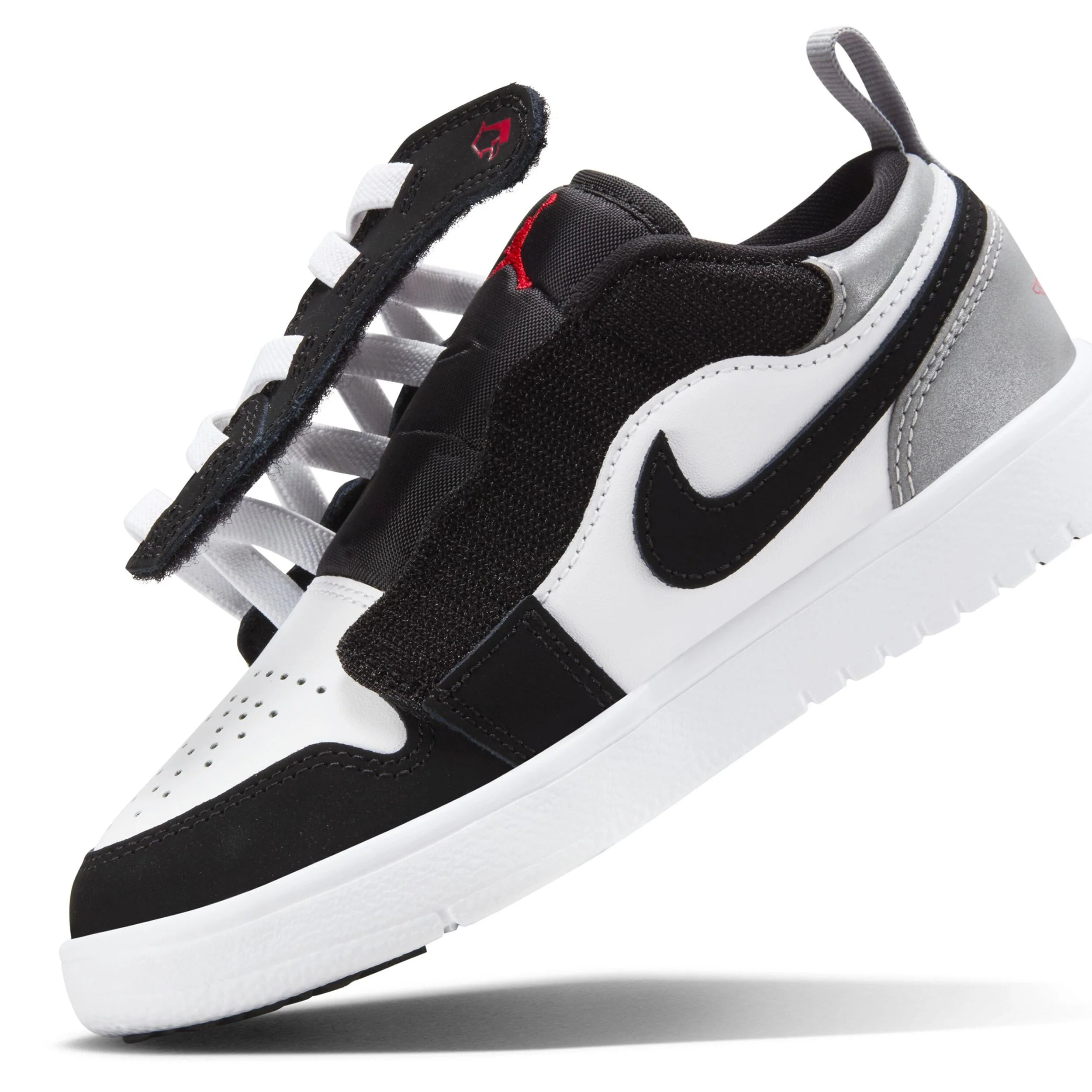 Getting your kiddo into stylish kicks has never been easier. The lace area on these Jordans is just for show. It lifts up and secures with a hook-and-loop closure---no tying of laces required.
