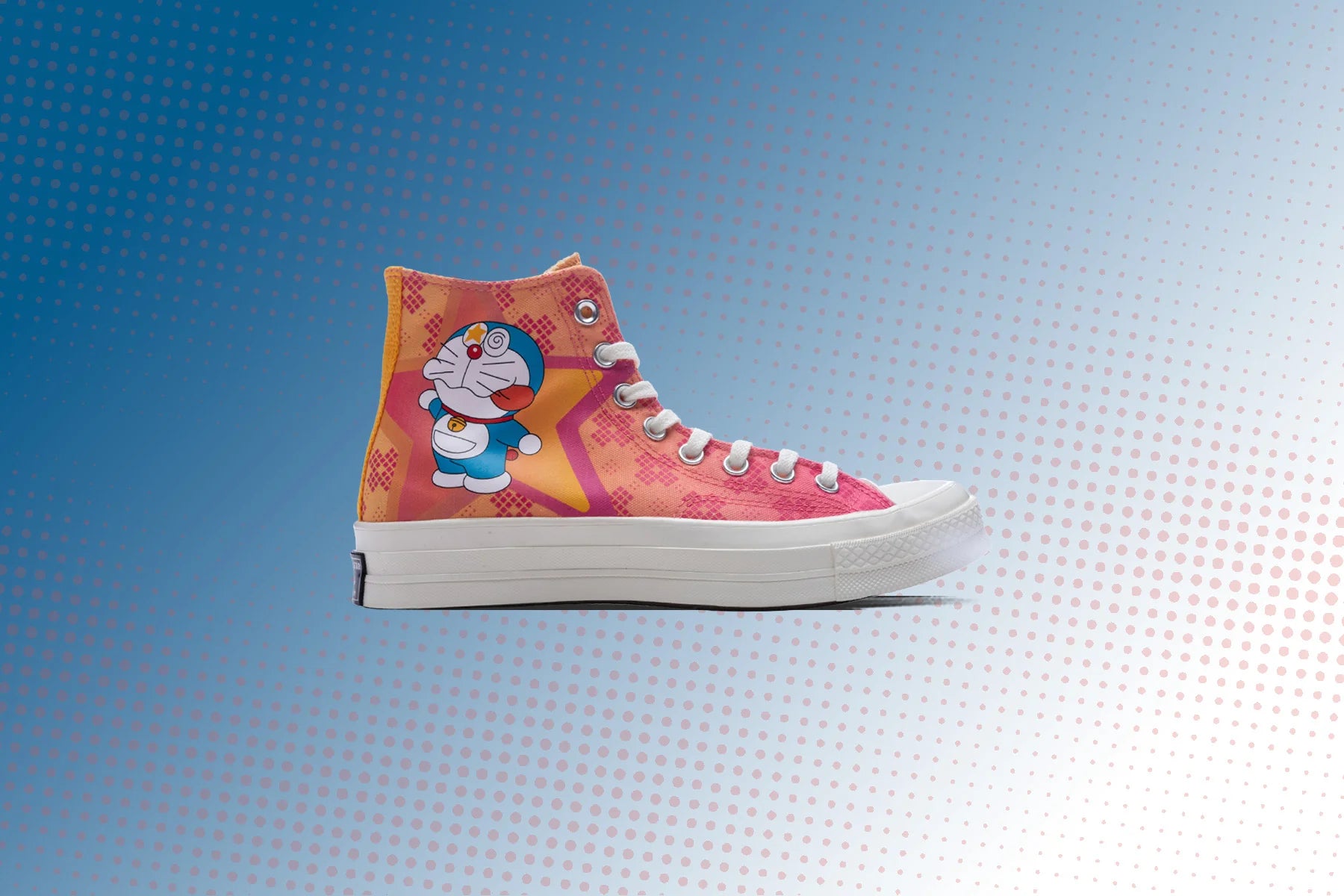 Converse celebrates the adored Japanese manga and anime series of the cat-type robot from the future, Doraemon, with its iteration of the Chuck 70 Hi. Constructed with a canvas upper with Doraemon graphic prints on the outer and inner parts of the shoe. Vibrant orange and pink accents makes it pop. All Star patches on the side gives its signature touch. The co-branded sockliner and custom Doraemon license plate on left shoe add to the playful design. The silhouette is complete with a full-lace closure, and a rubber toe box and outsole for extended durability.