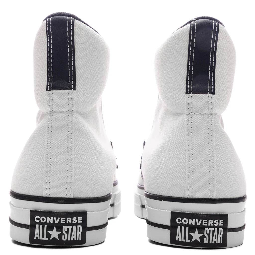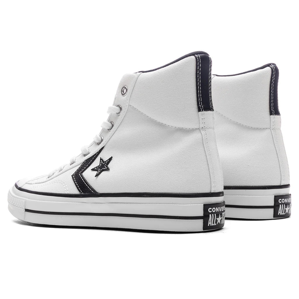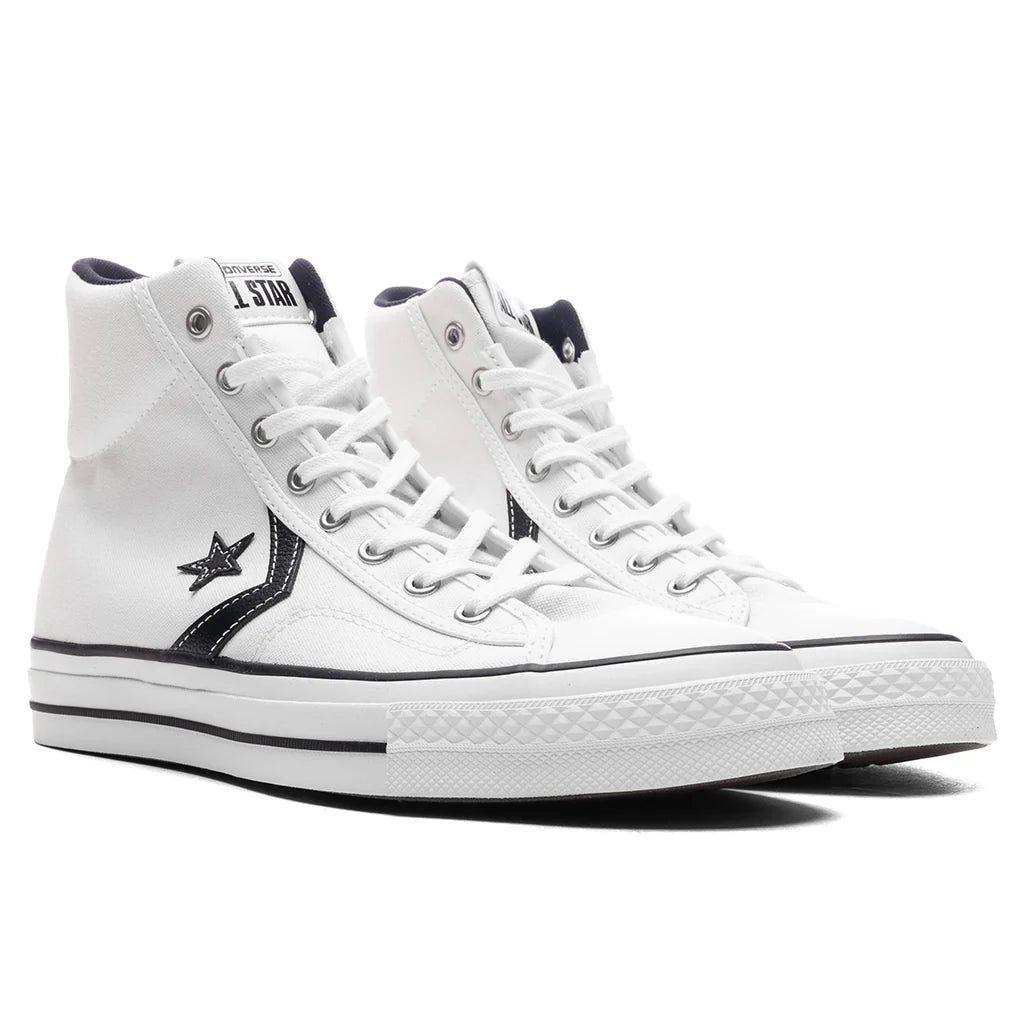 Now in a high top, the Converse Star Player 76 HI is constructed from a durable canvas cotton with contrast stitching based on vintage sport styles from the brand. OrthoLite cushioning, a padded collar, and more space than the classic Chucks, this sneaker provides optimal comfort. A leather Star Chevron on the side panel completes the design.