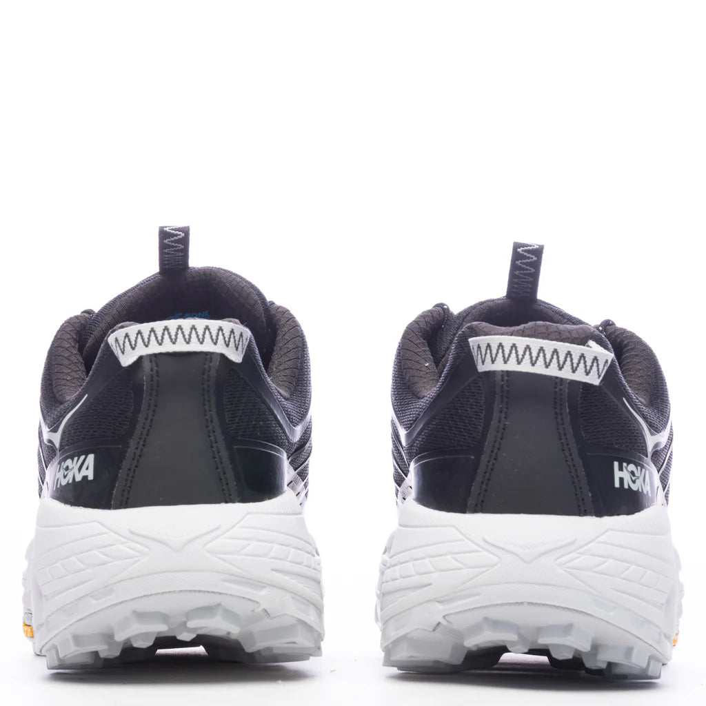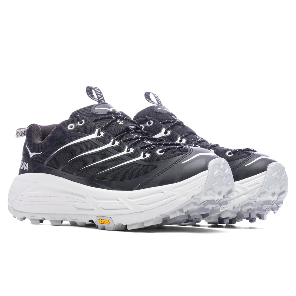 Hoka combines elements from the Mafate Speed 2 and Mafate 3 to create the Mafate Three2 in a Black/Cosmic Grey colorway. It features the cushioned sole of the Mafate Speed 2 and the distinctive upper of the Mafate 3. This hybrid sneaker includes a gusseted tongue and quick-lace system. The mesh upper ensures breathability, while the internal gusset provides a secure fit.