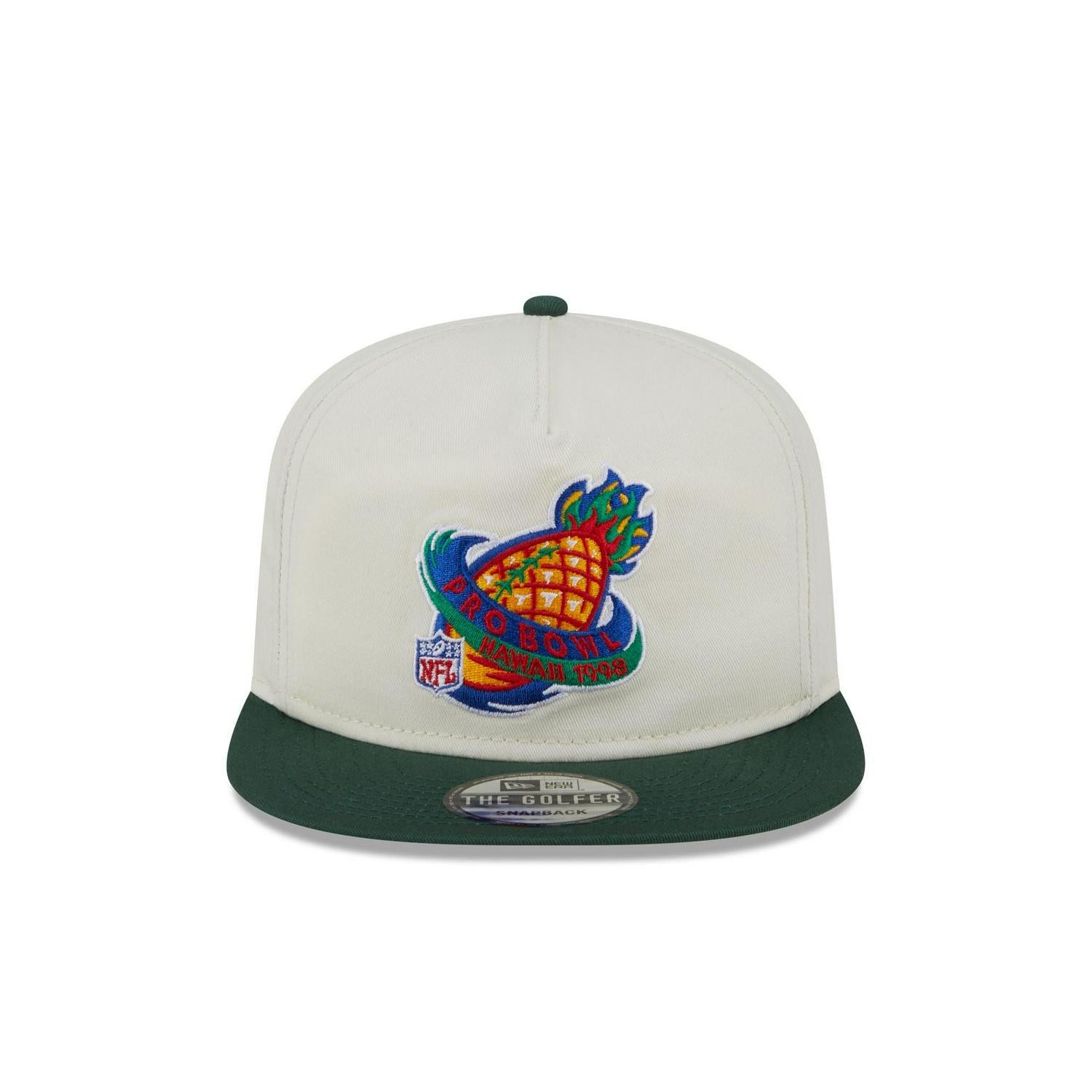The Green Bay Packers Pro Bowl Patch Golfer Cap features an embroidered 1998 Pro Bowl patch at the front panels with a Packers logo on the right-wear side with snapback closure at the rear, a green visor, and gray undervisor.