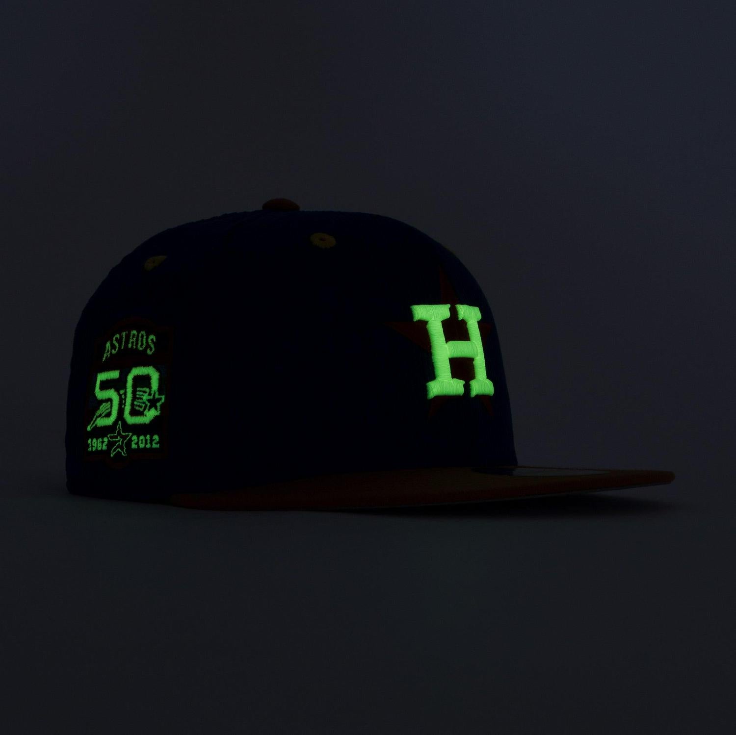 This New Era exclusive desgin features the Hoston Astros. This 59Fifty Fitted Hat is constructed of an all over blue cord crown with Glow-In-The-Dark team logo on the front panel, exclusive patch on the side panel and a contrast orange bill.
