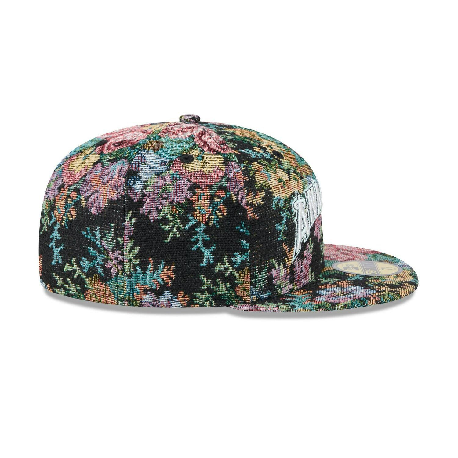 The Los Angeles Angels Jacquard Pattern 59FIFTY Fitted Cap features an embroidered Angels Cooperstown wordmark at the front panels with a matching MLB Batterman logo at the rear. Additional details include a floral jacquard pattern throughout and a gray undervisor.