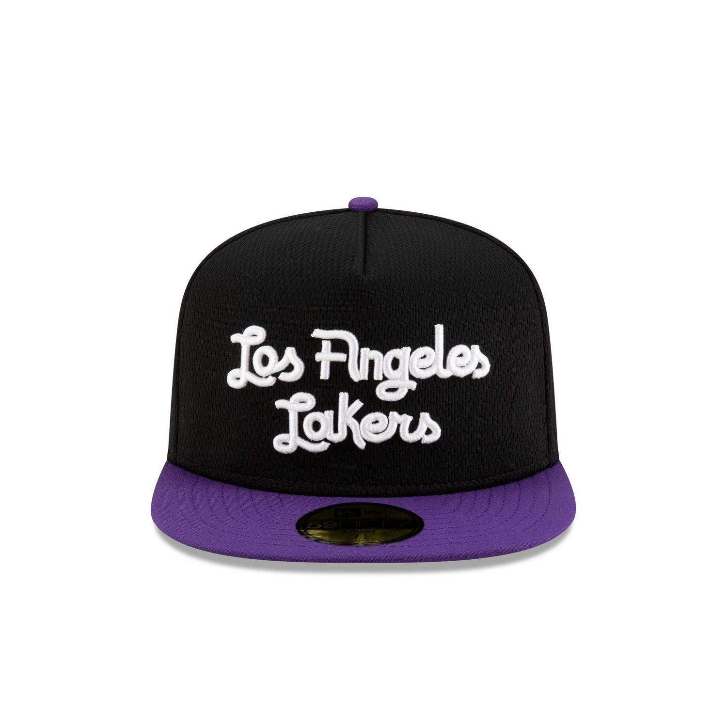 The Los Angeles Lakers Dashmark Mesh 59FIFTY A-Frame Fitted Cap features an embroidered Lakers Dashmark Mesh wordmark at the front panels with a logo at the rear and a gray undervisor.