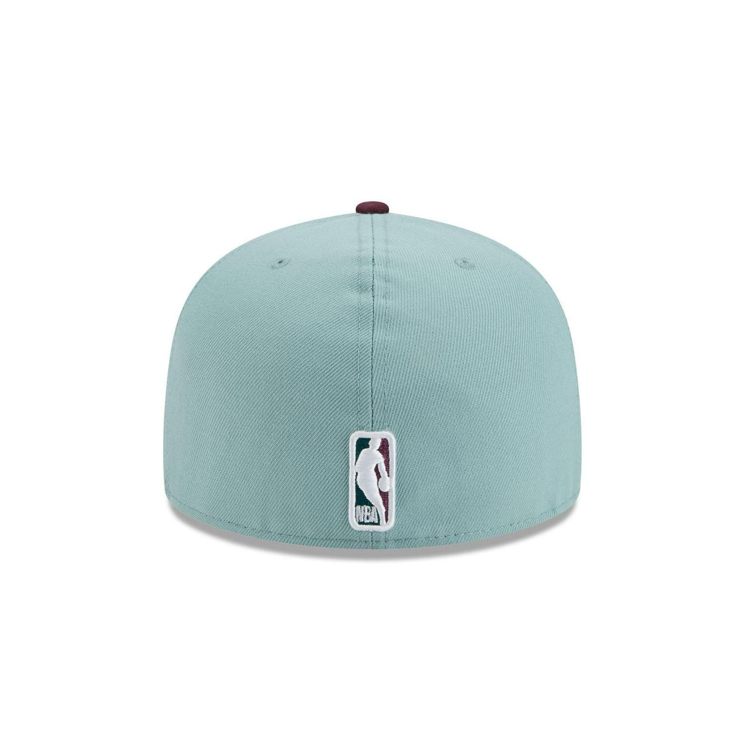 The Milwaukee Bucks Beach Kiss Blue 59FIFTY A-Frame Fitted Cap features an embroidered Bucks logo at the front panels with a matching NBA Logoman at the rear and a gray undervisor.