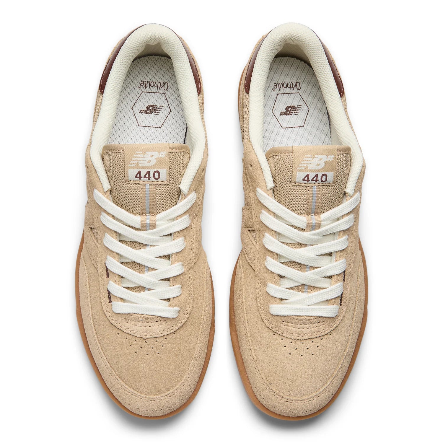 The NB Numeric 440 V2 blends leading edge technology with soft cushioning to create a go-to shoe for both everyday skate and wear. A foam wedge in the heel helps enhance comfort, while a reinforced toe helps absorb wear and tear from skateboarding. The NM440J2 features a tan suede upper on a gum rubber sole.