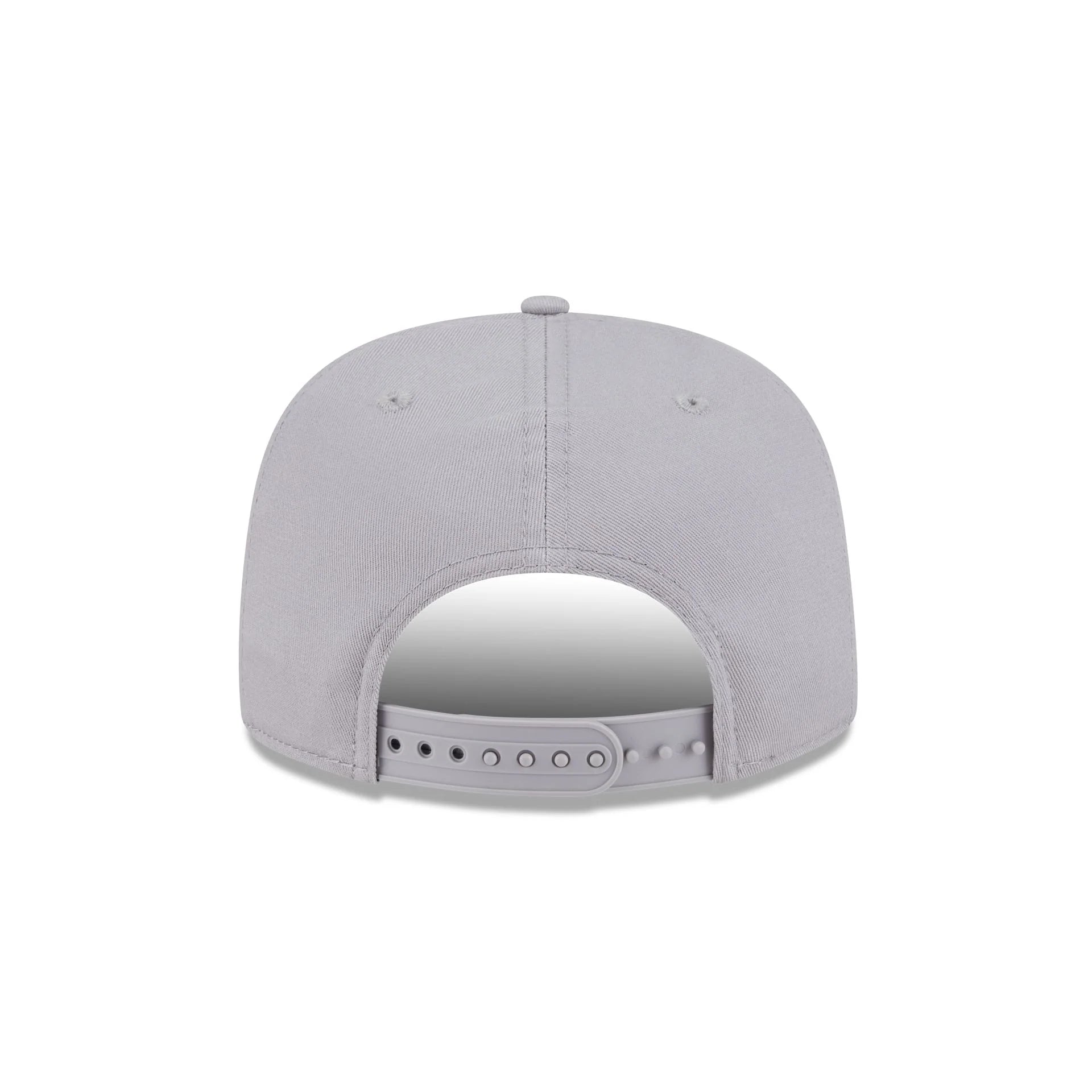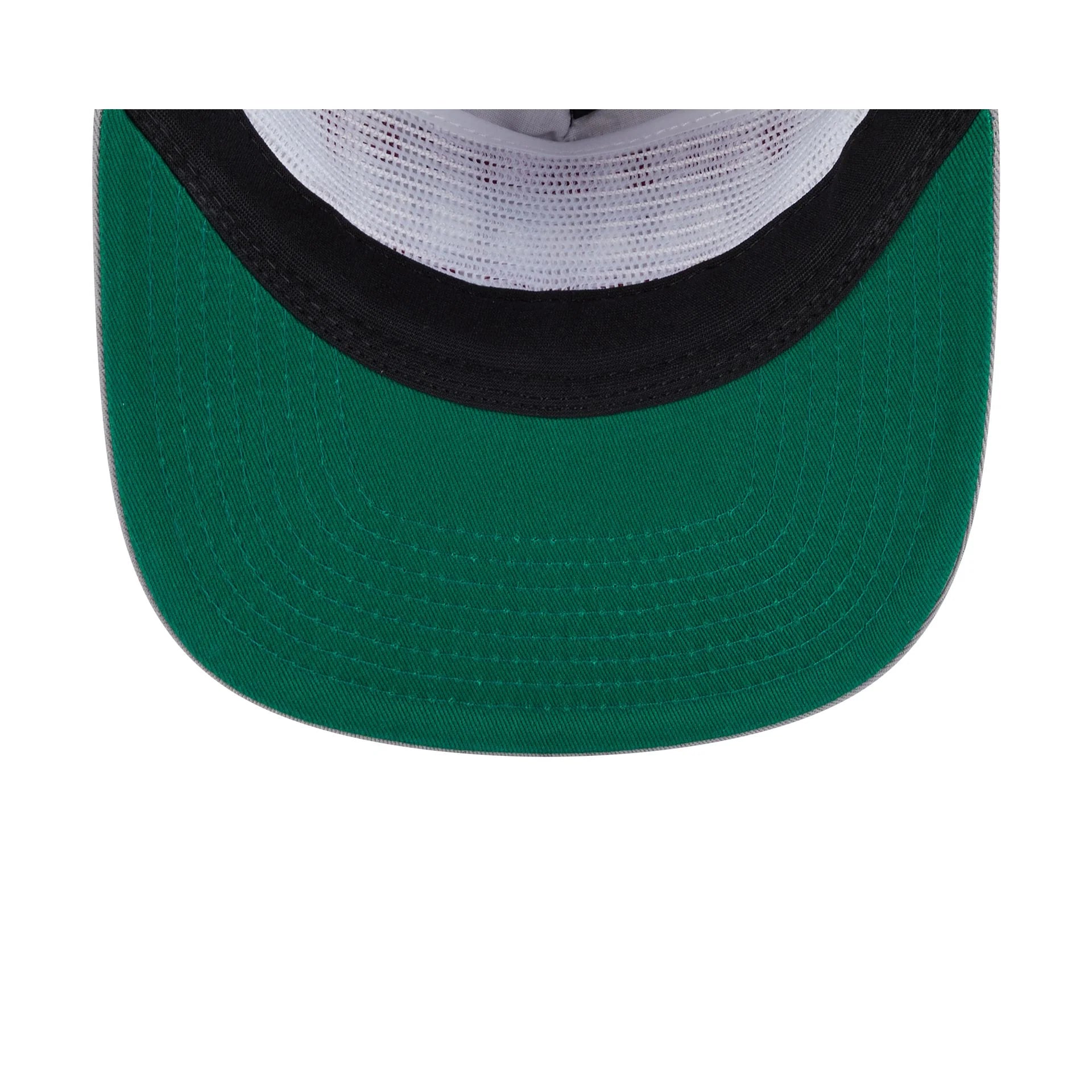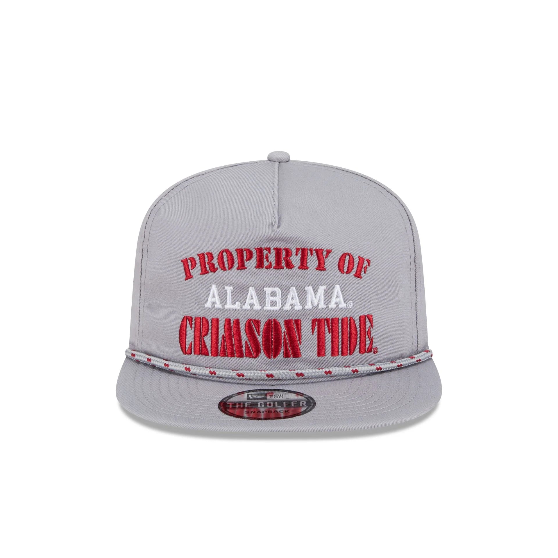 The Alabama Crimson Tide Vintage Gray Golfer features an embroidered "PROPERTY OF" Crimson Tide wordmark at the front panels with a team logo at the right-wear side and a rope at the visor. Additional details include a snapback closure at the rear and a green undervisor.
