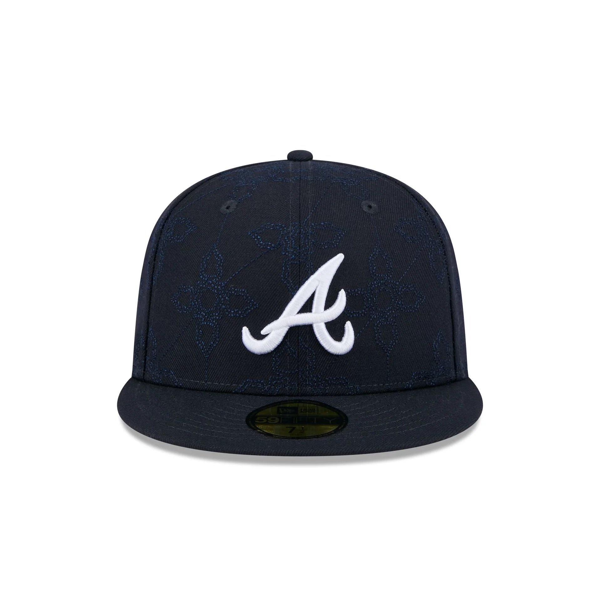 The Atlanta Braves Color Pattern 59FIFTY Fitted Cap features an embroidered Braves logo at the front panels against a floral patterning throughout. Additional details include a matching MLB Batterman logo at the rear and a gray undervisor.