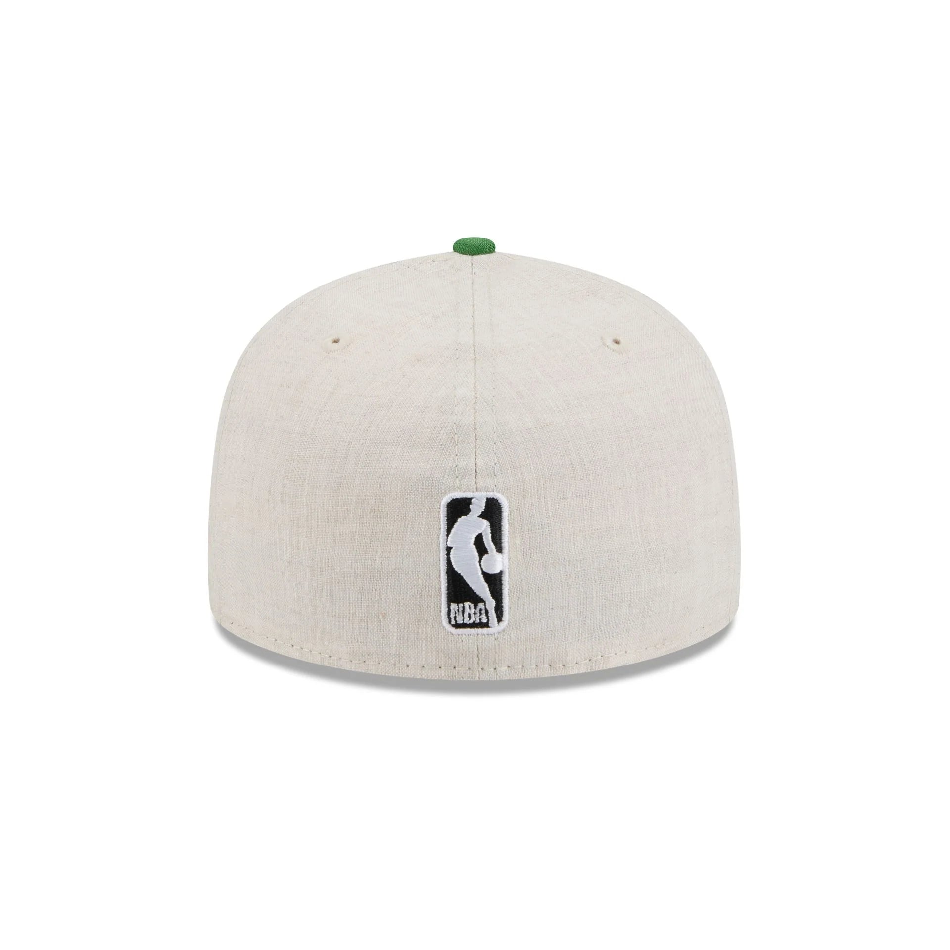 The Boston Celtics Linen 59FIFTY Fitted Cap features an embroidered Celtics logo at the front panels against a linen fabrication with a matching NBA Logoman at the rear. Additional details include a team wordmark at the right-wear side and a gray undervisor.