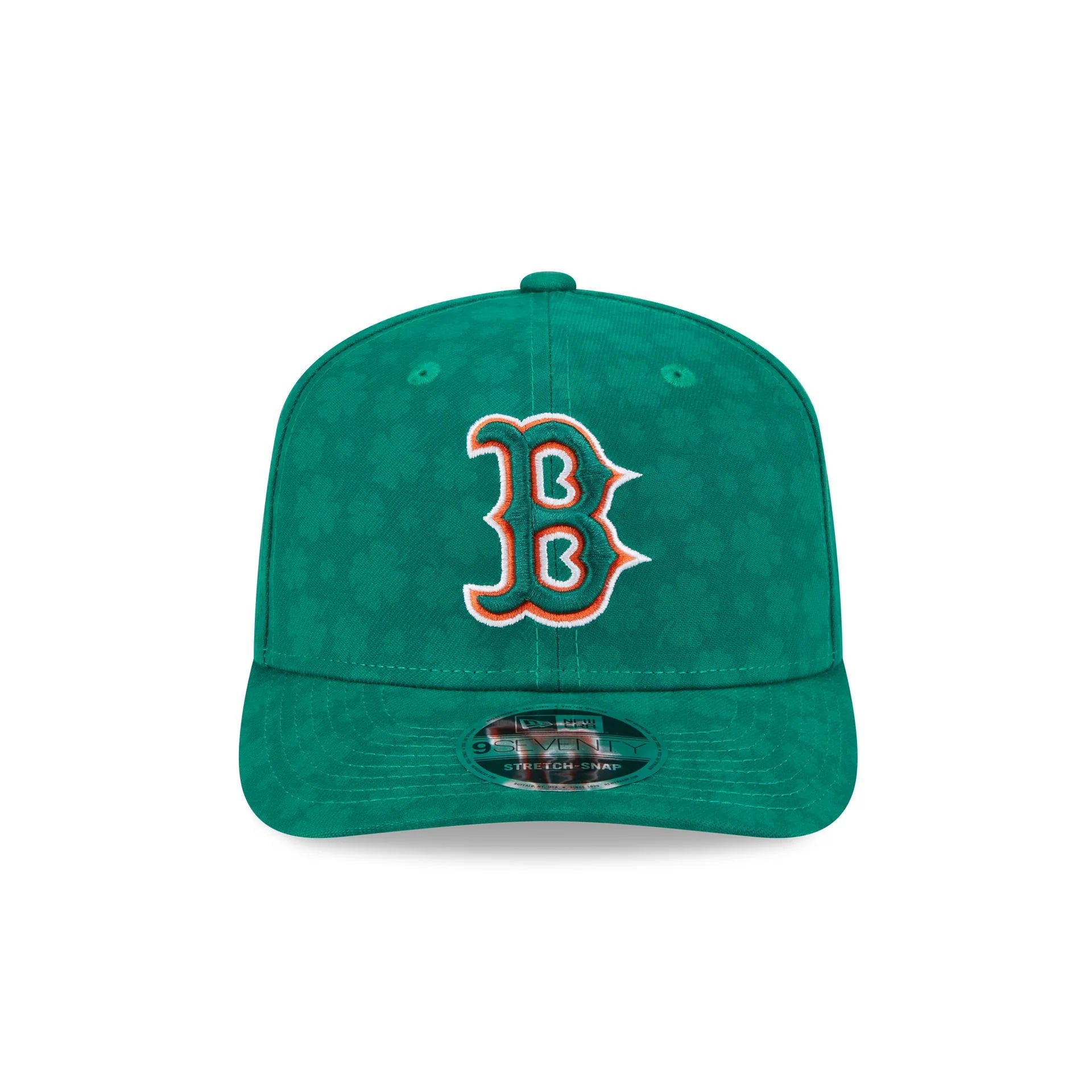 The Boston Red Sox St. Patrick's Day 2025 9SEVENTY Stretch-Snap Cap features an embroidered Red Sox logo at the front panels with a four-leaf clover pattern throughout the cap, a snapback closure at the rear, and a gray undervisor.