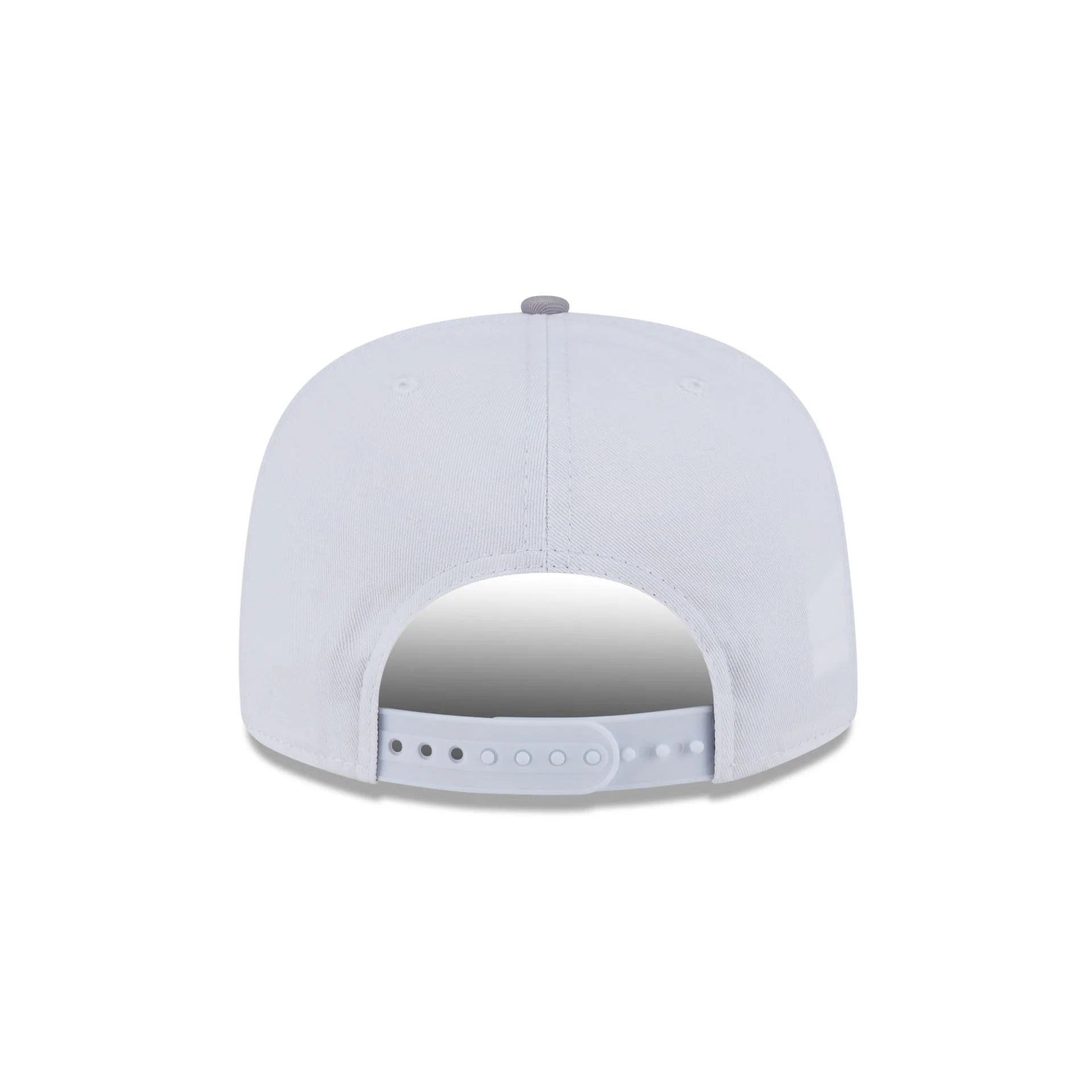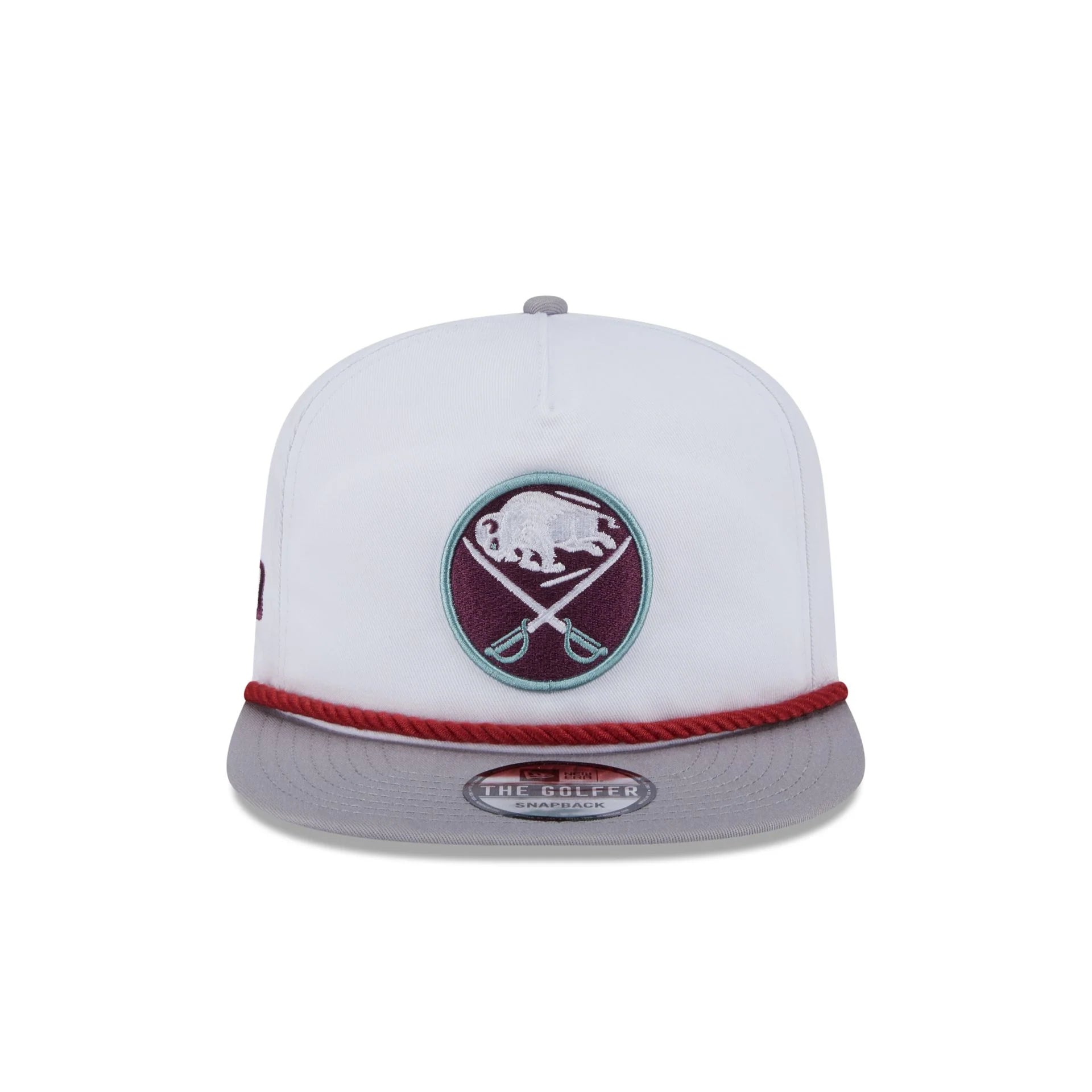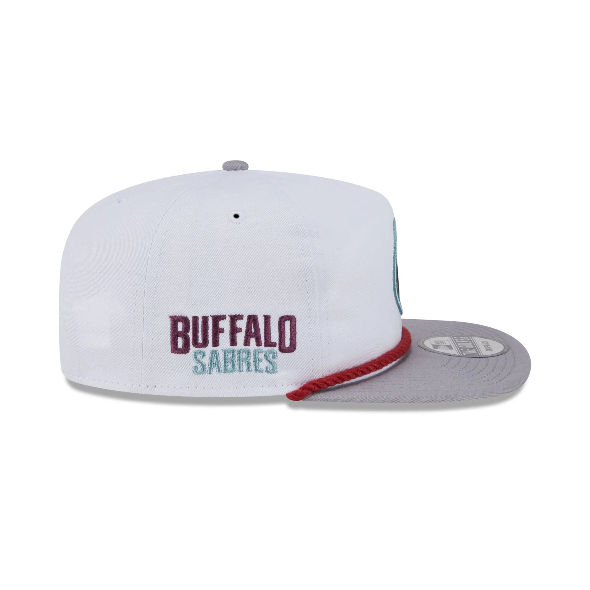 The Buffalo Sabres Optic White Golfer features an embroidered Sabres logo at the front panels with a matching team wordmark at the right-wear side. Additional details include a snapback closure at the rear and a teal undervisor.