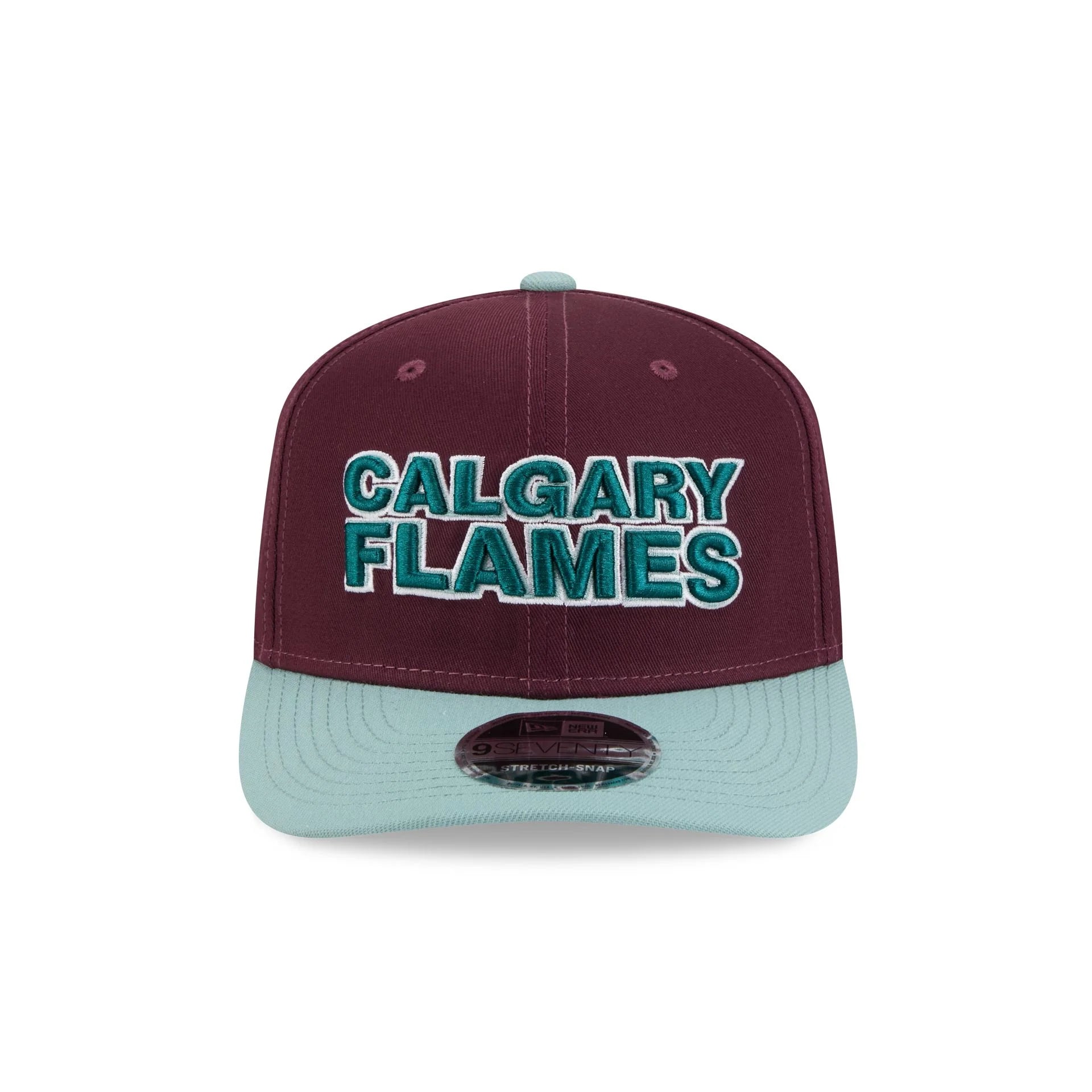 The Calgary Flames Maroon 9SEVENTY Stretch-Snap features an embroidered Flames logo at the front panels with a snapback closure at the rear and a teal undervisor.