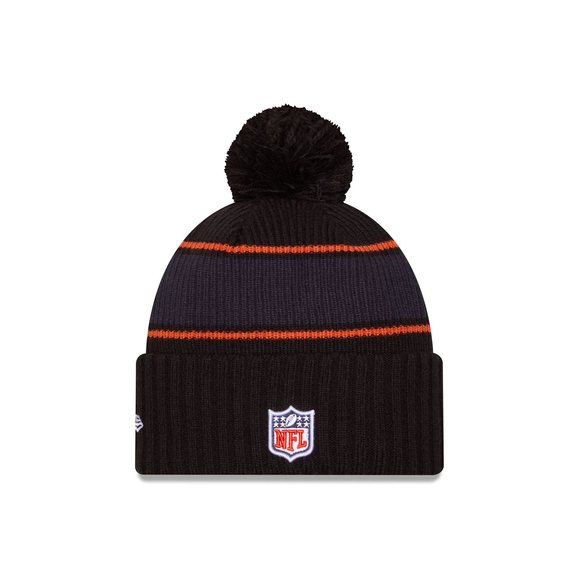 The Chicago Bears 2024 Cold Weather Black Pom Knit Hat features an embroidered Bears logo at the front cuff with a matching NFL Shield at the rear. Additional details include a team wordmark at the crown and a one-time removable pom.