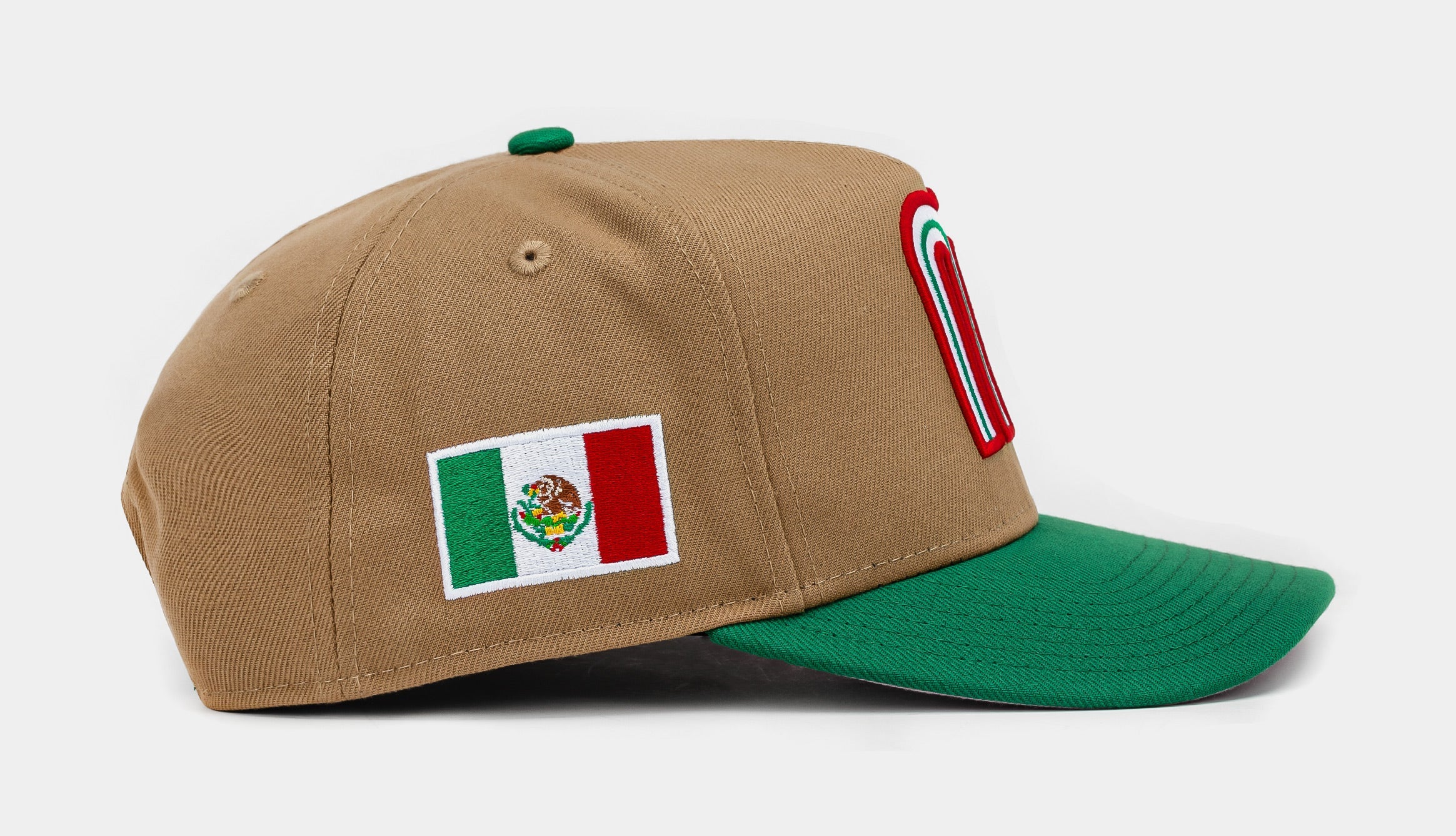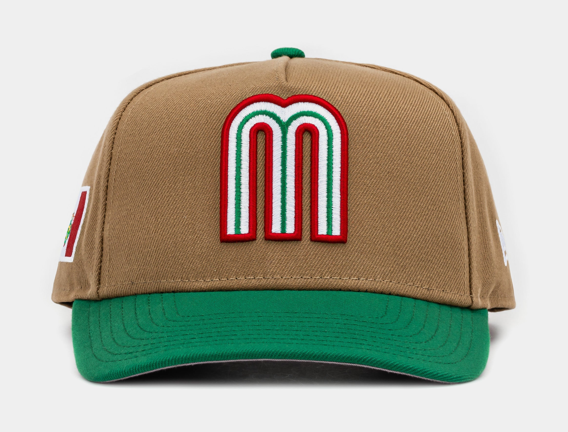 This New Era exclusive design features a Mexico design. This 950AF Hat is constructed of an all over brown crown Mexico on the front panel, exclusive patch on the side panel and a contrast green bill. Find this New Era design exclusively.