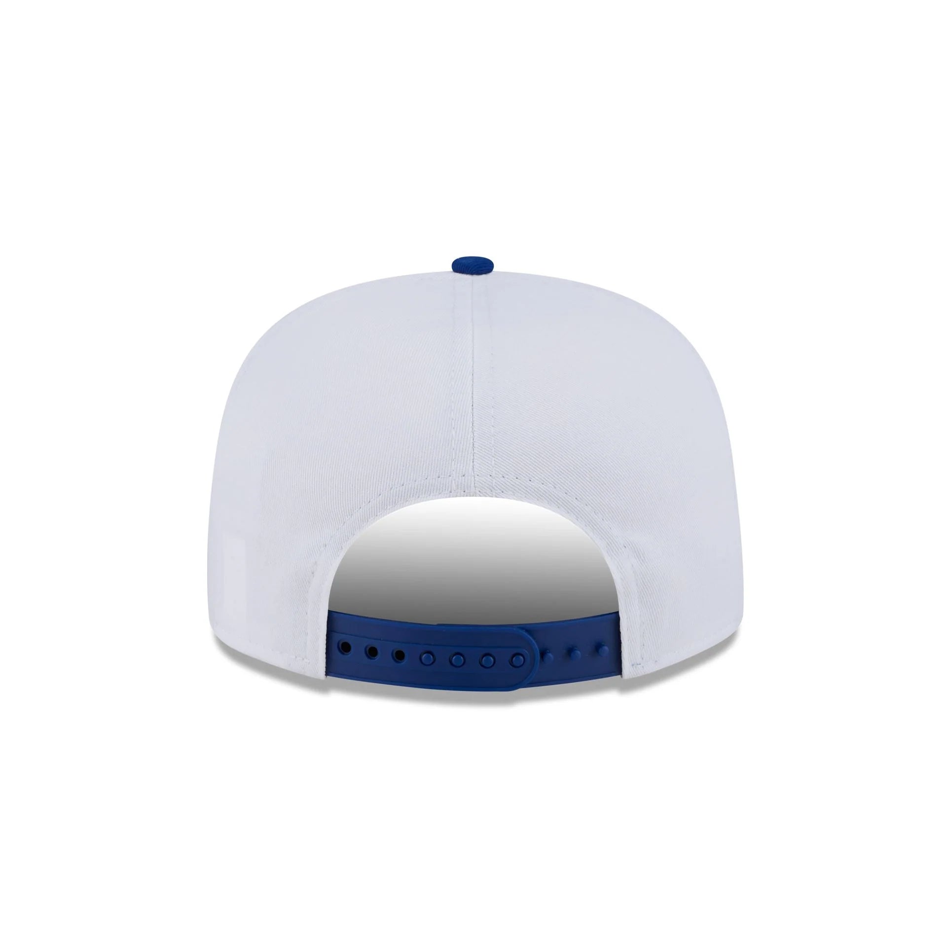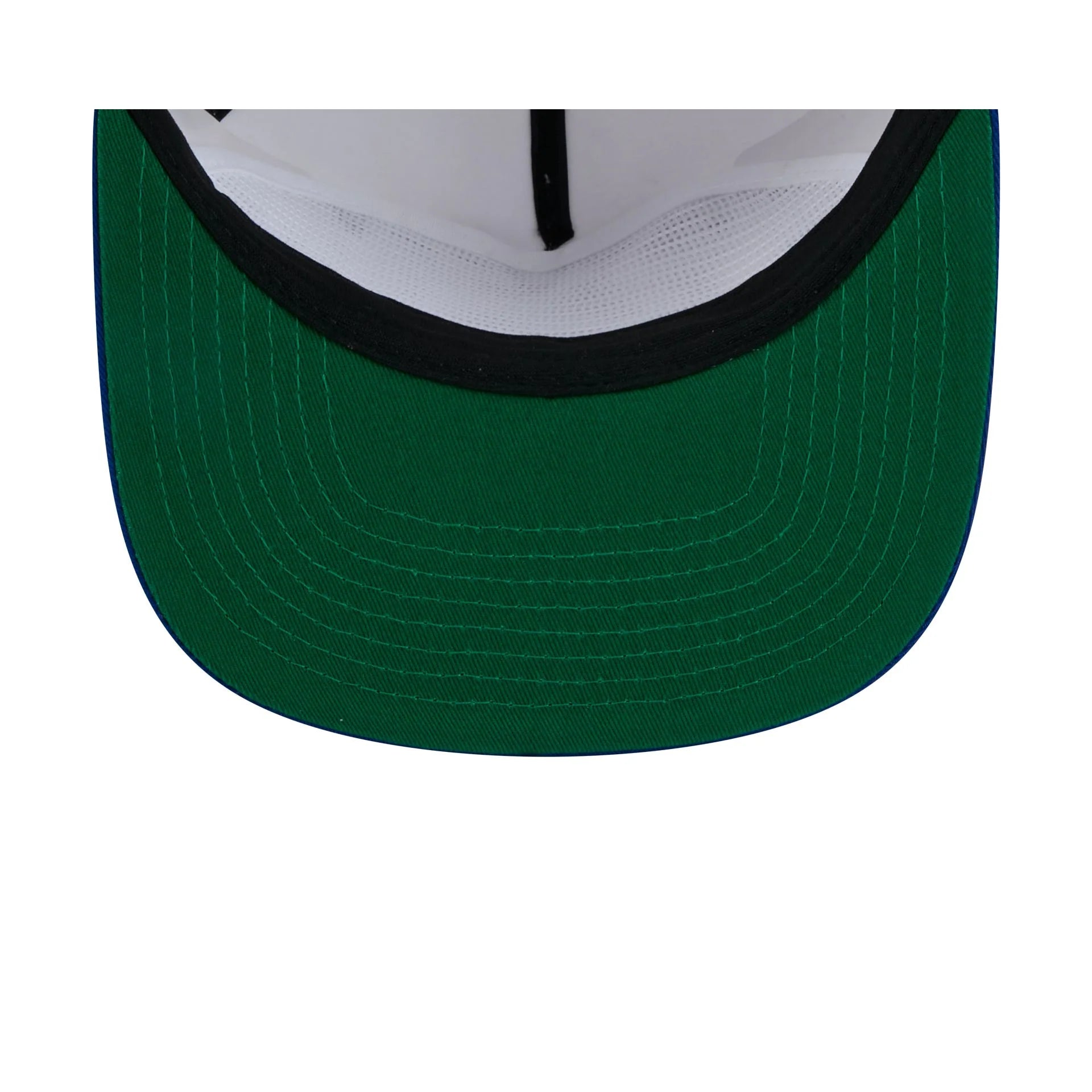 The MLB World Series 1986 Championship Pin Golfer features an embroidered 1986 World Series patch with dueling New York Mets and Boston Red Sox pins and team wordmarks at the front panels. Additional details include a blue visor with green undervisor and an adjustable snapback closure at the rear.