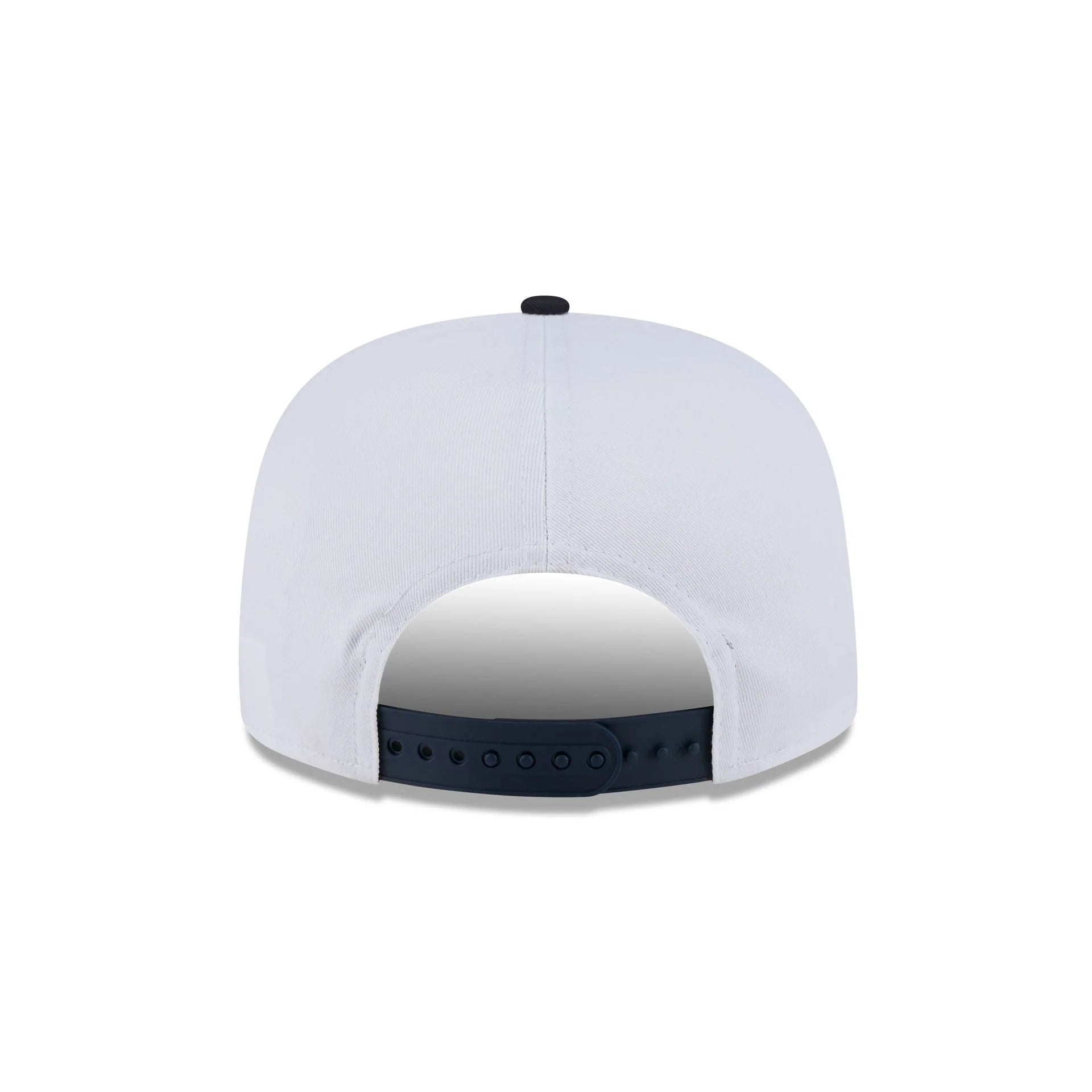 The MLB World Series 2002 Championship Pin Golfer features an embroidered 2002 World Series patch with dueling Los Angeles Angels and San Francisco Giants pins and team wordmarks at the front panels. Additional details include a navy visor with green undervisor and an adjustable snapback closure at the rear.