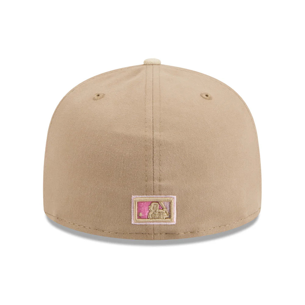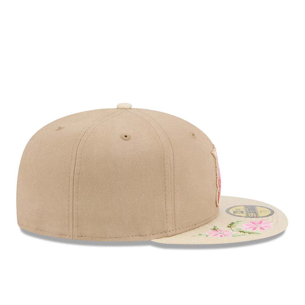 The Miami Marlins Hand Stitched Floral 59FIFTY Fitted Cap features an embroidered Marlins pink Cooperstown logo at the front panels with a matching MLB Batterman logo at the rear. Additional details include a flower embroidery at the visor and a gray undervisor.