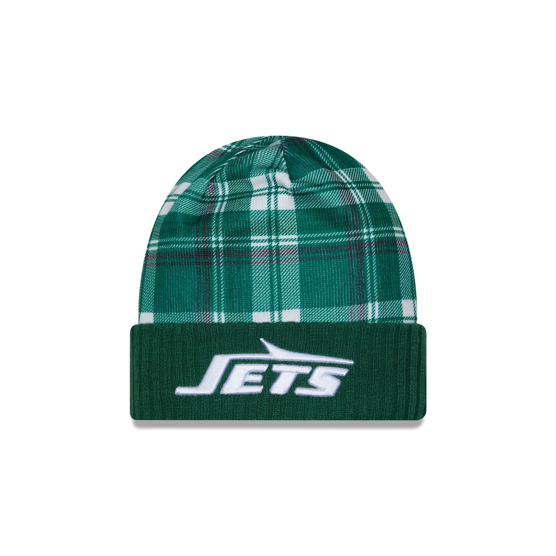 The New York Jets 2024 Cold Weather Statement Knit Beanie features an embroidered Jets logo at the front cuff with a matching NFL Shield at the rear and a plaid print throughout the crown.