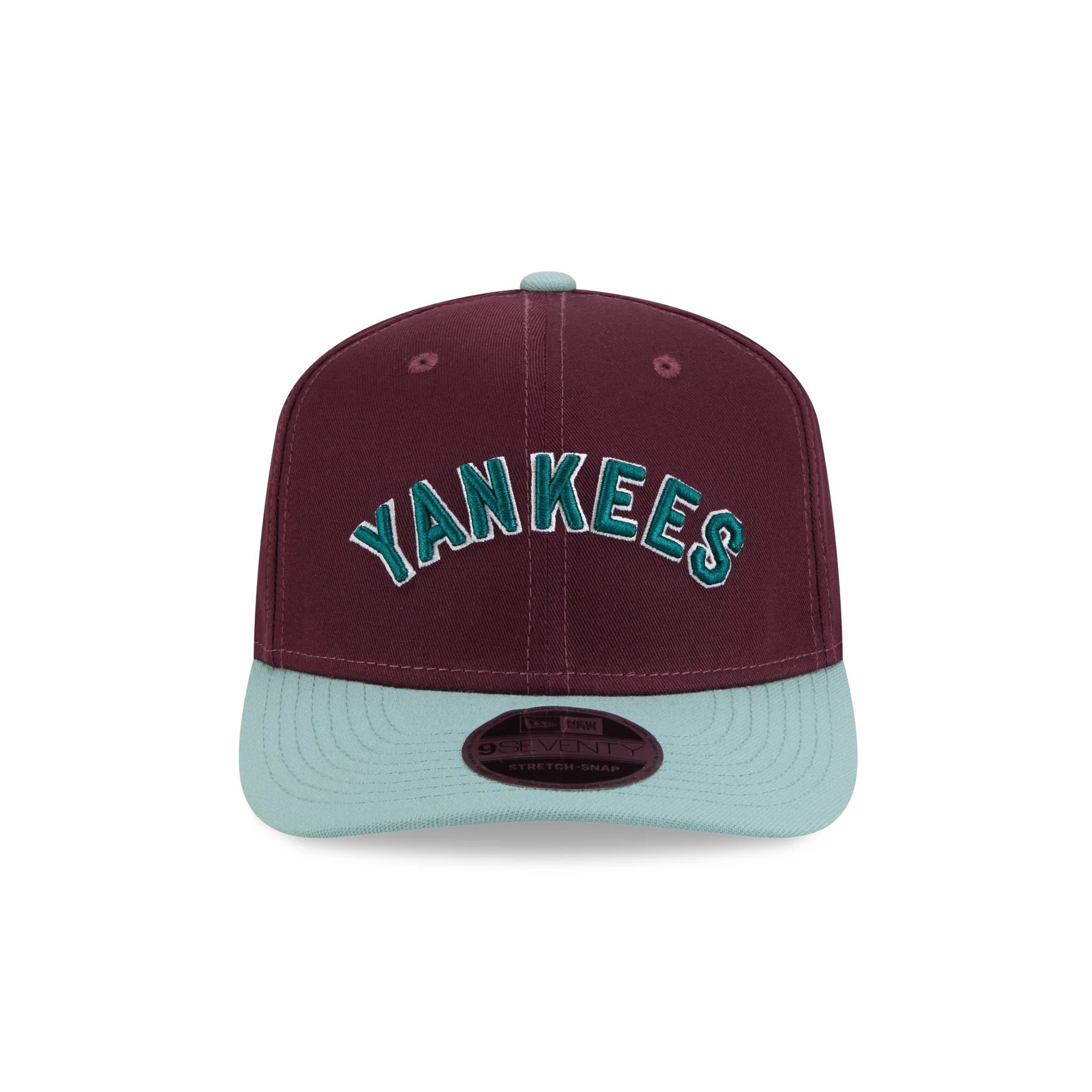 The New York Yankees Maroon 9SEVENTY Stretch-Snap features an embroidered Yankees Cooperstown logo at the front panels with a snapback closure at the rear and a teal undervisor.