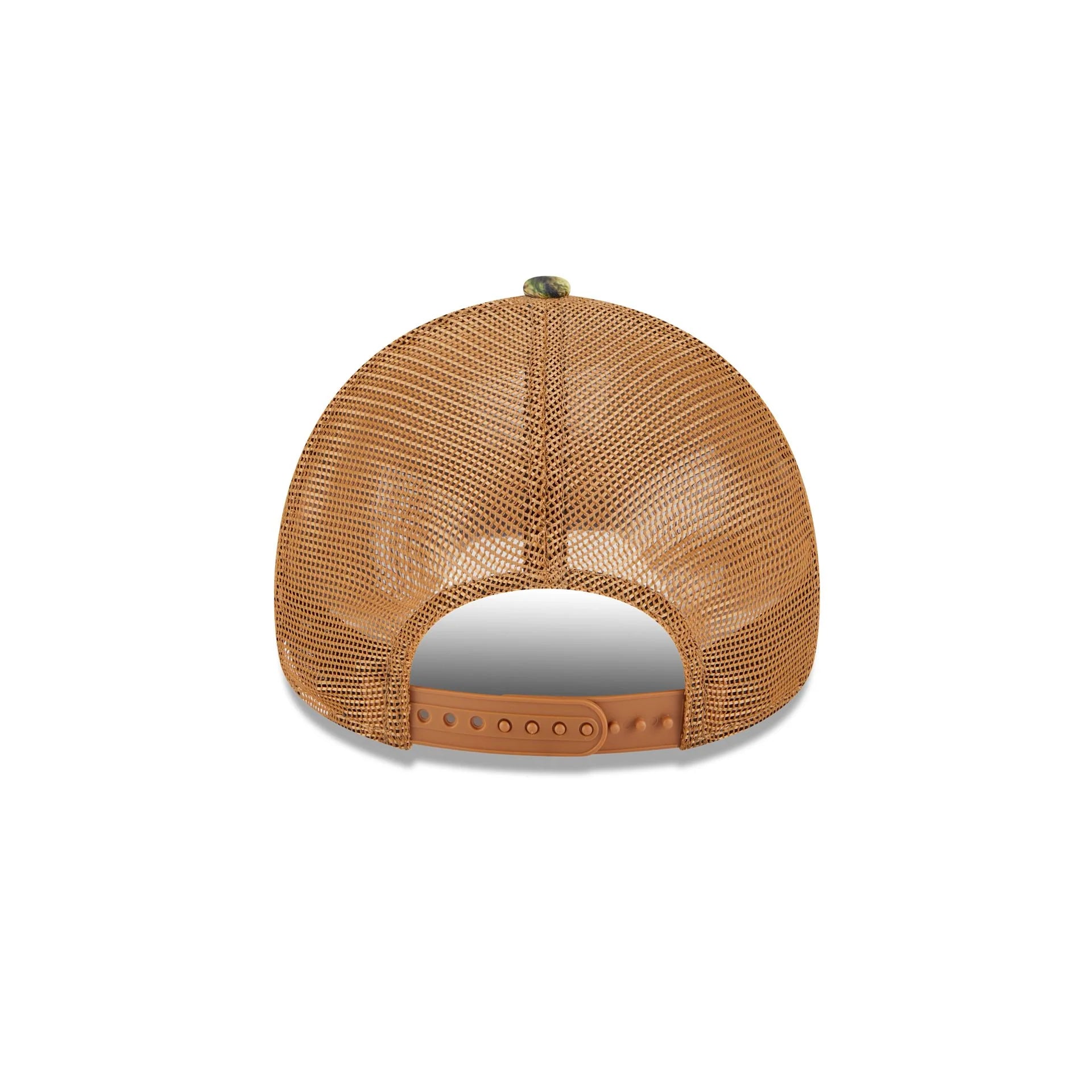 The Phoenix Suns 2025 All-Star Game Fan Pack Grove 9FORTY A-Frame Trucker features an embroidered Suns wordmark at the front camo panels with a mesh back. Additional details include a team logo on the right-wear side, a snapback closure at the rear, and a gray undervisor.