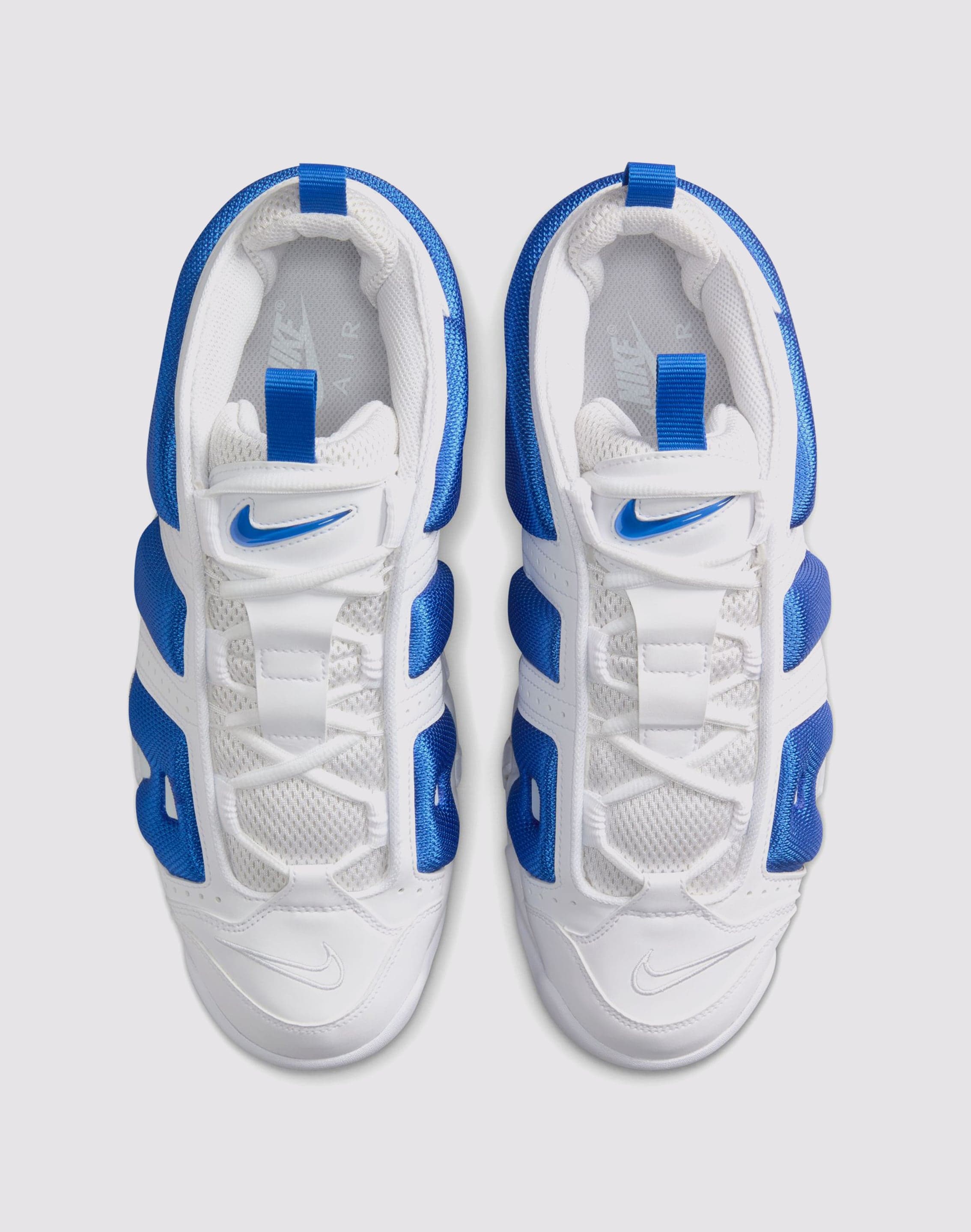 With high-flying basketball style and graffiti-inspired graphics, the Nike Air More Uptempo Men's "White/Hyper Royal/Psychic Blue" Shoe is sure to turn heads on and off the court. This low-top version pairs Air cushioning and a padded collar so you feel as good as you look.