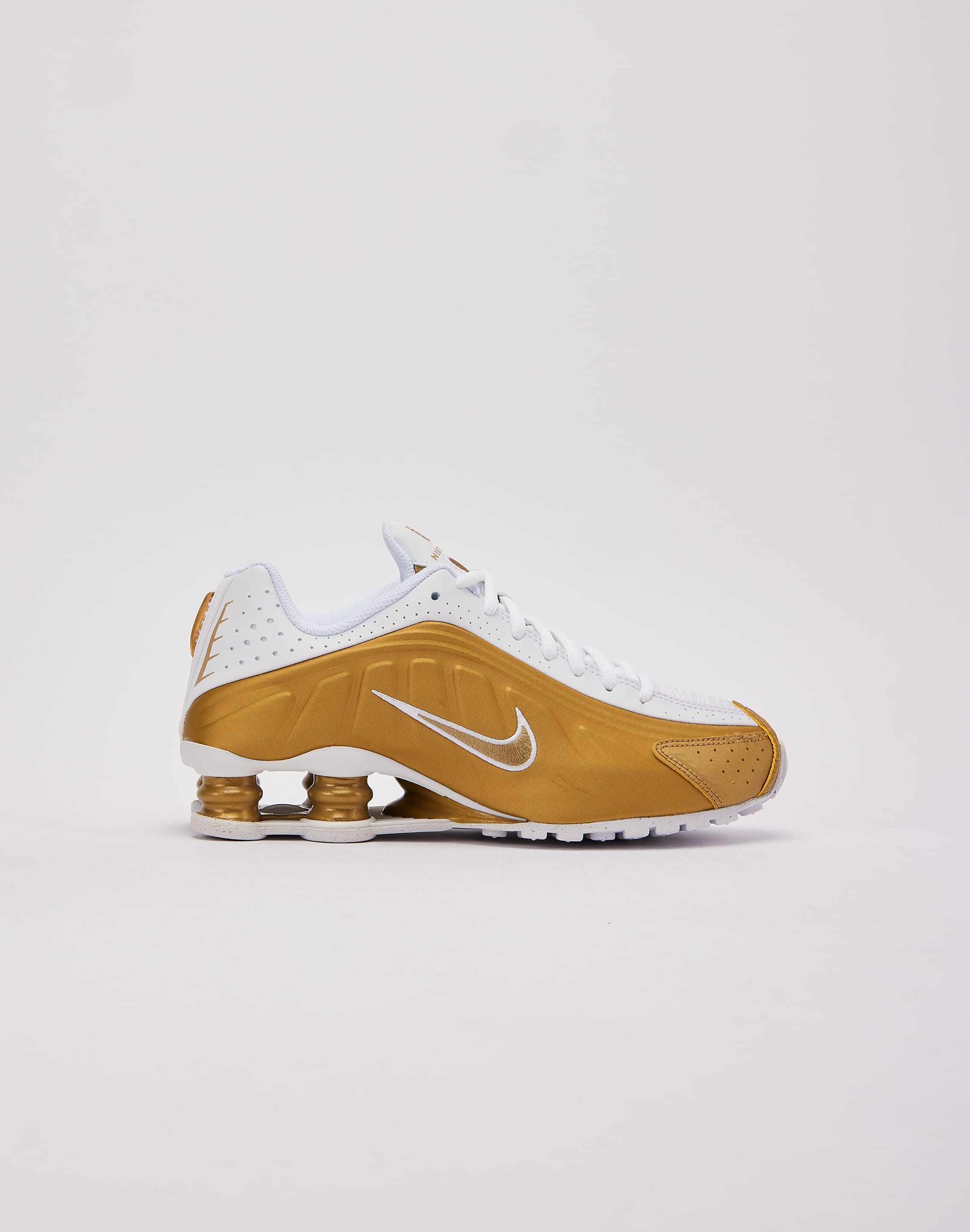 The Nike Shox R4 brings bold, retro style with its iconic Shox cushioning, delivering responsive comfort and shock absorption with every step. Its sleek, streamlined upper and metallic accents make it stand out.