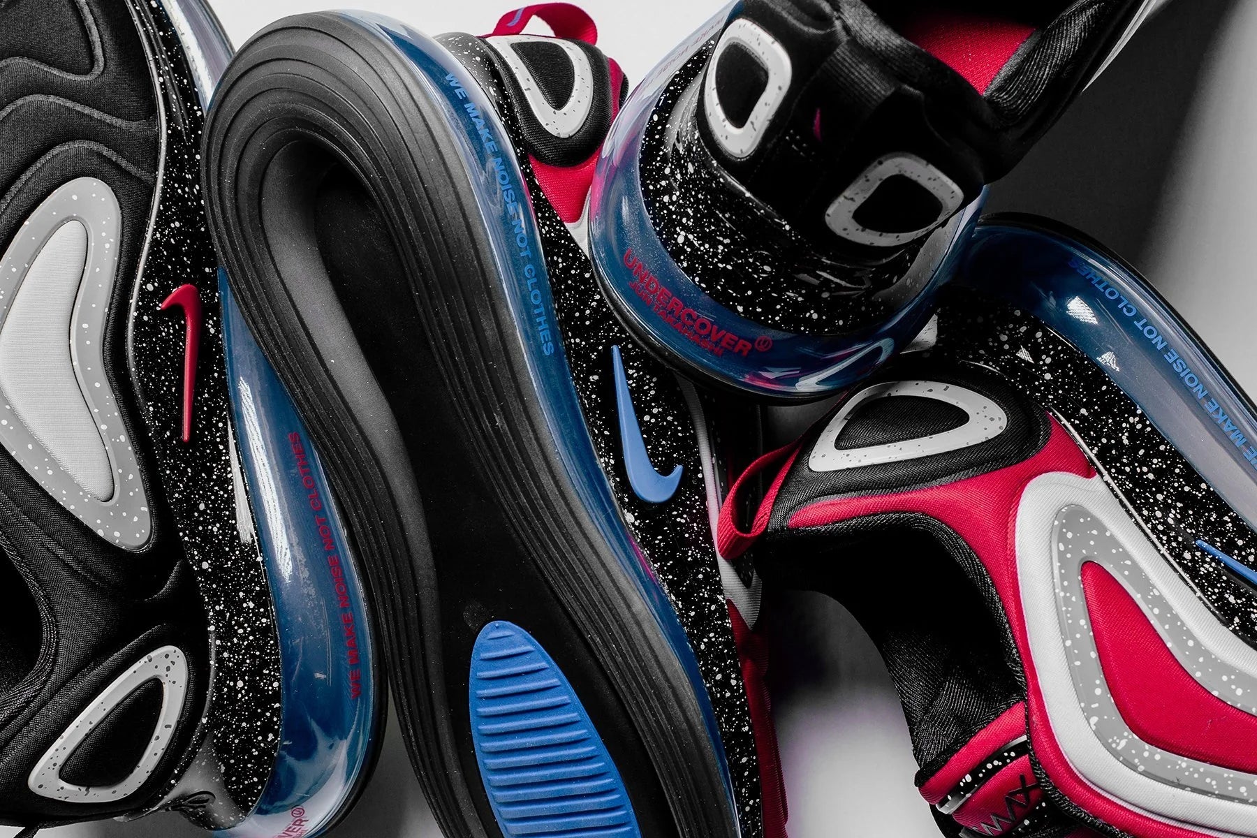 The Nike x Undercover Air Max 720 shoe was designed with disruptive intentions, and in collaboration with UNDERCOVER’s Jun Takahashi, the sneaker is elevated to even higher levels of distorting the status quo. Air Max first launched in 1987 for performance running, but the Air Max 720 takes a different tack, injecting and expanding Max Air technology into a pure lifestyle sneaker by making the sole a full-length visible Air unit 6mm taller than any before it. With the 720, all-day comfort stands out like never before. Pictured is the Nike x Undercover Air Max 720 shoe in University Red/Blue Jay.