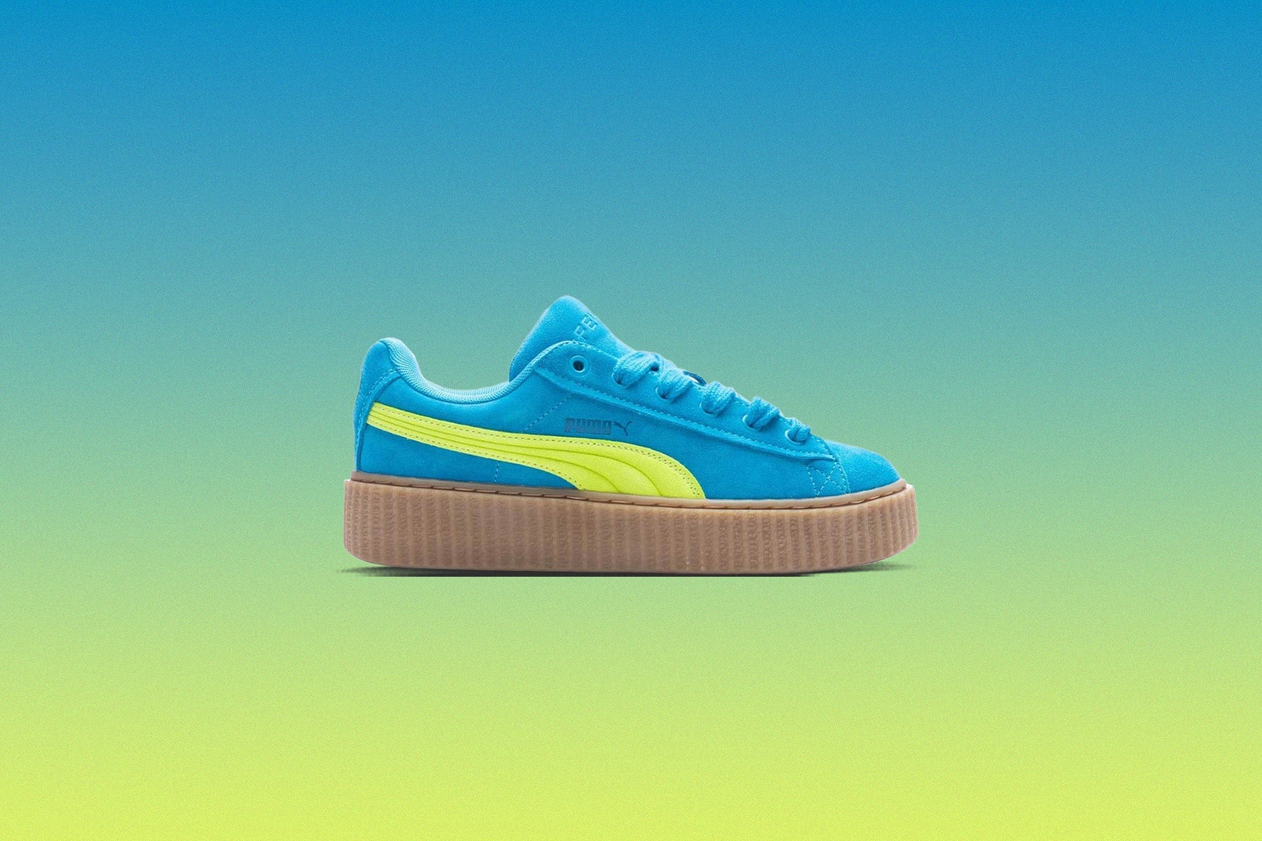Introducing the vibrant FENTY x PUMA Creeper Phatty. Its strikingly bright blue suede upper complements a padded green suede Formstrip. Emblazoned with debossed FENTY branding and featuring gold aglets, these sneakers are perfectly finished with a crepe gum sole, defining an iconic pair.