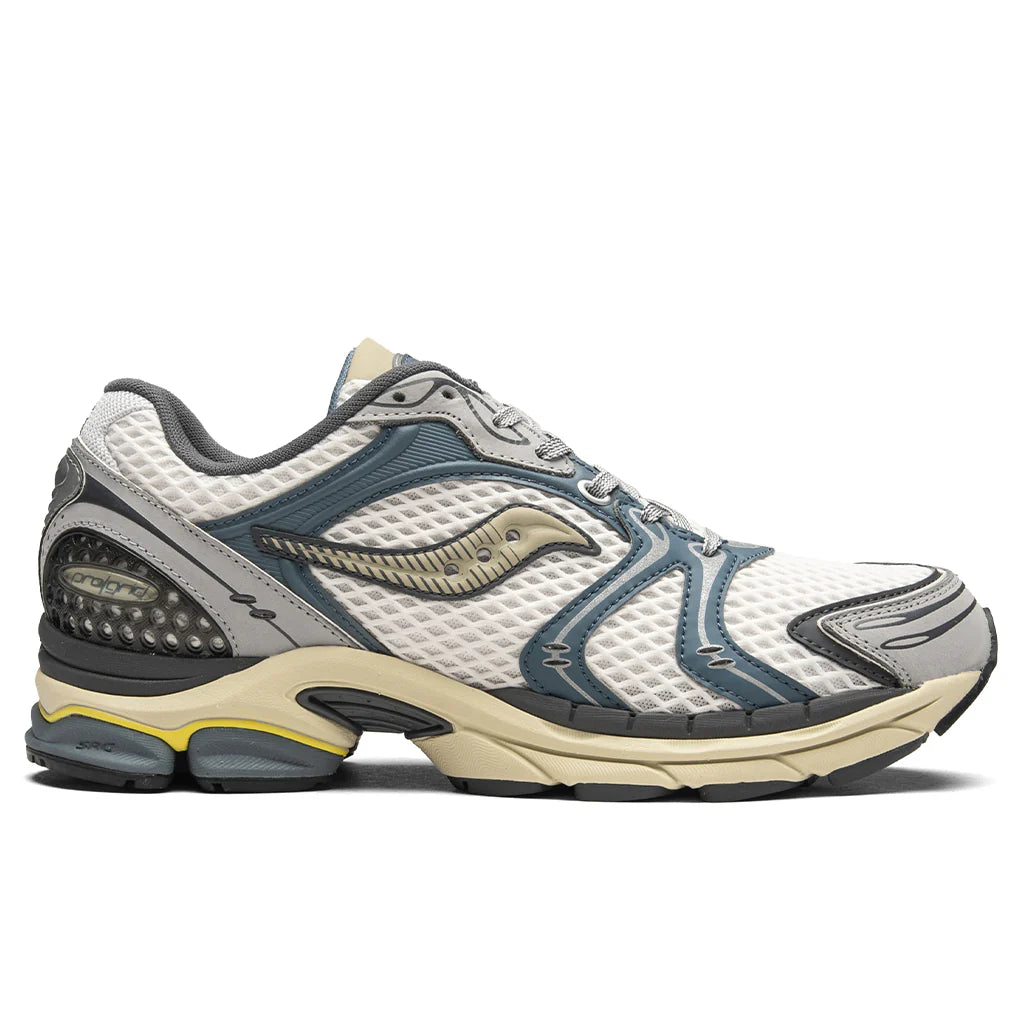 Inspired by the 2007 model, the Saucony ProGrid Triumph 4 makes an impression with its technological aesthetic. The sneaker’s mesh upper and chrome overlays make a statement. The medial panel is packed with Arch-lock technology, and the midsole has ProGrid technology. Nostalgia meets innovation with this silhouette, and its rubber outsole underneath completes the design.