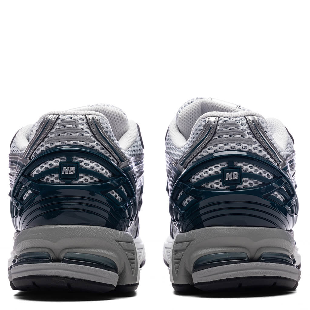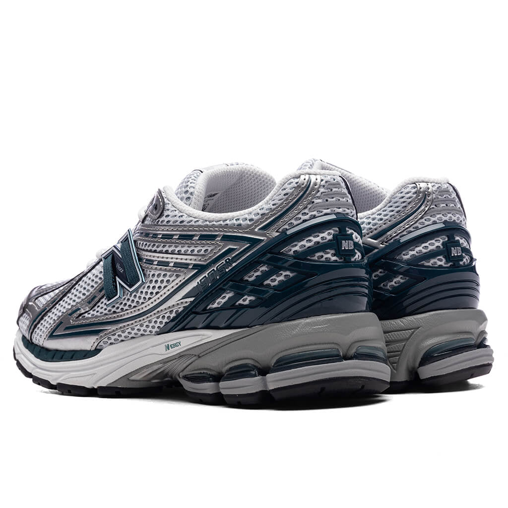 The 1906 in Silver Metallic/Deep Ocean/White pairs a breathable mesh upper with supportive synthetic overlays, delivering both comfort and durability. Underfoot, ACTEVA LITE midsole cushioning and ABZORB SBS heel cushioning create a responsive, well-cushioned ride. N-ergy and Stability Web elements in the outsole ensure stability and traction, making these sneakers a balanced blend of style and performance.