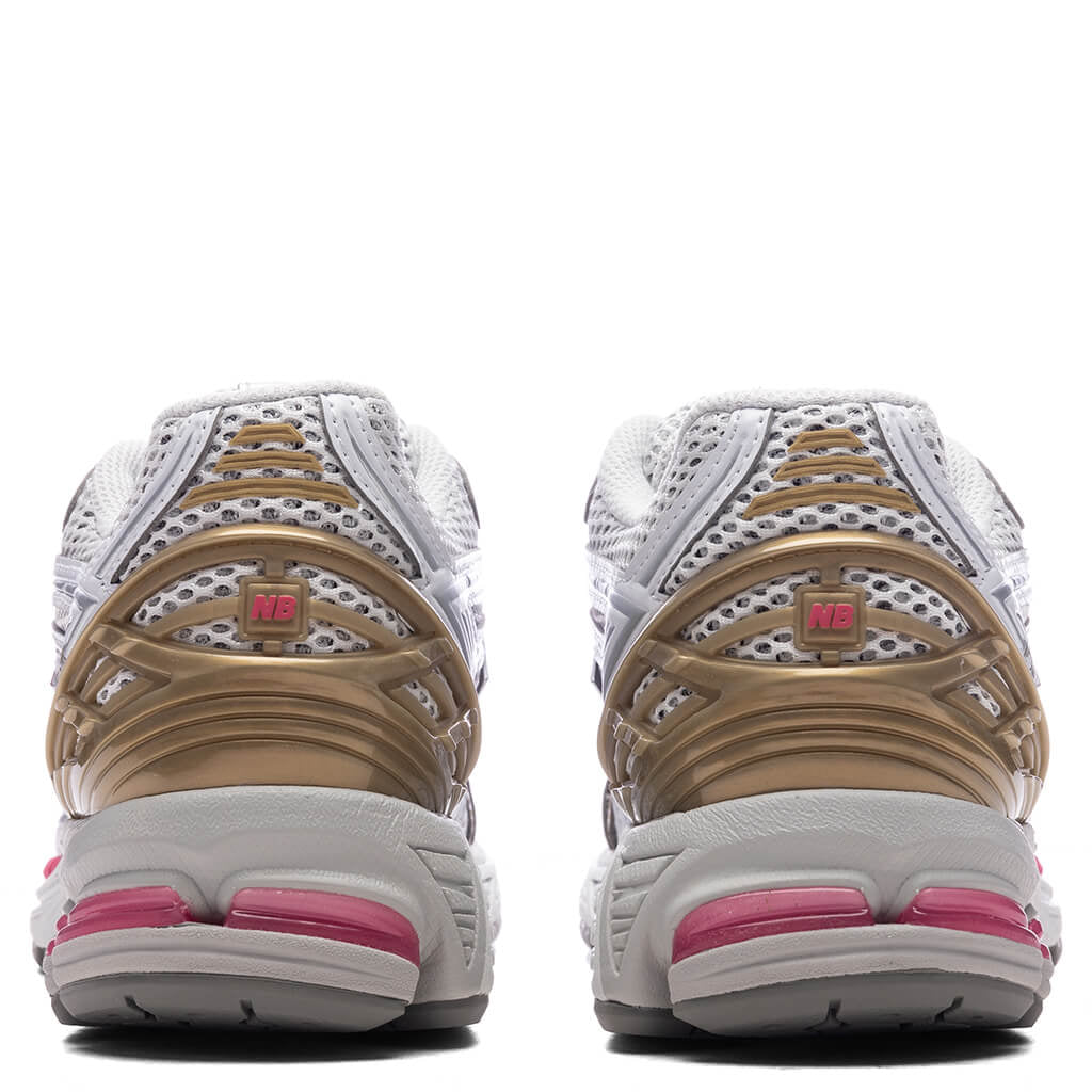 The 1906R in Silver Metallic/Dragon Berry/White pairs a breathable mesh upper with supportive synthetic overlays, delivering both comfort and durability. Underfoot, ACTEVA LITE midsole cushioning and ABZORB SBS heel cushioning create a responsive, well-cushioned ride. N-ergy and Stability Web elements in the outsole ensure stability and traction, making these sneakers a balanced blend of style and performance.