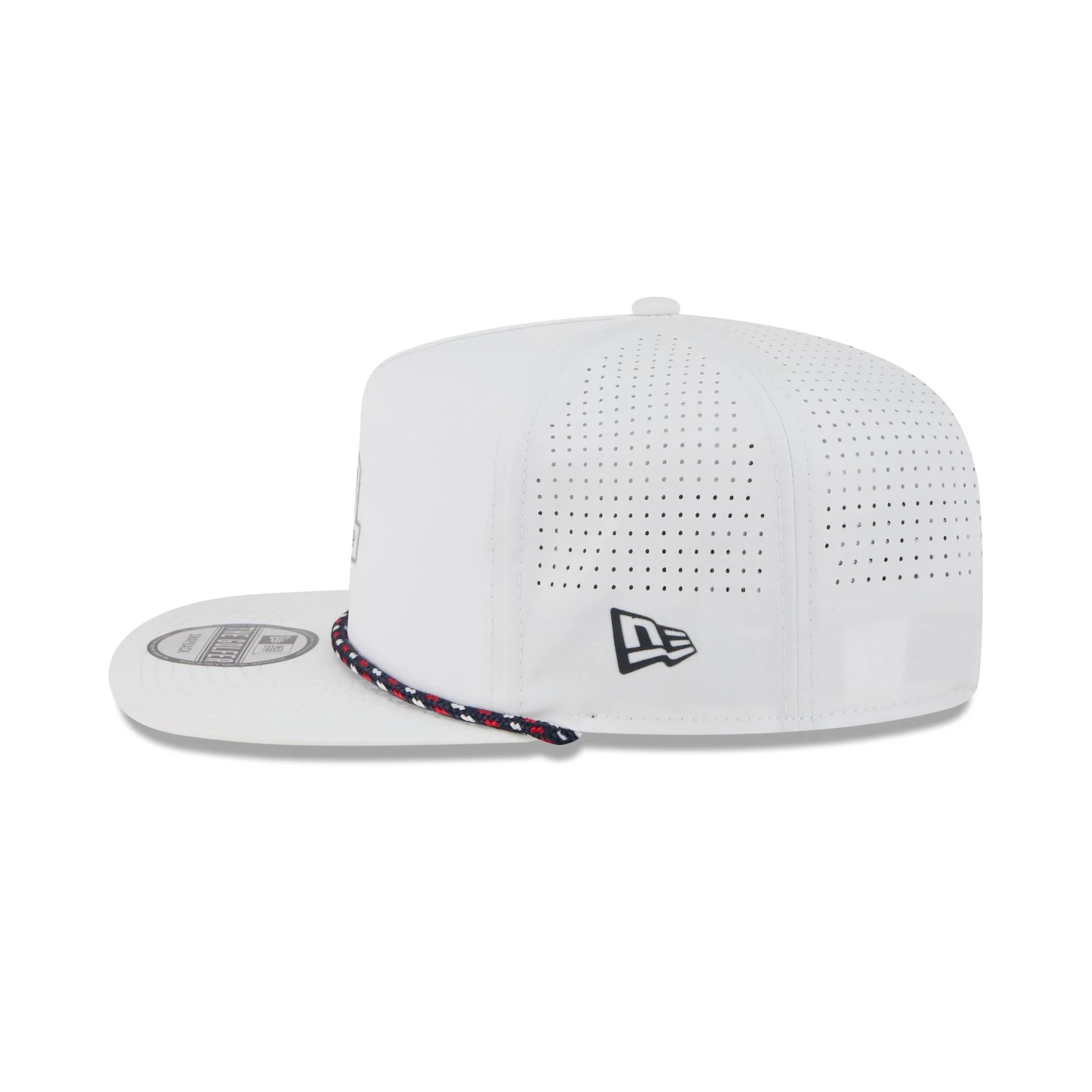 The 2025 Ryder Cup Performance Golfer features an embroidered Ryder Cup logo at the front panels with the American Flag at the right-wear side. Additional details include performance mesh side panels, a rope at the visor, and a snapback closure at the rear.