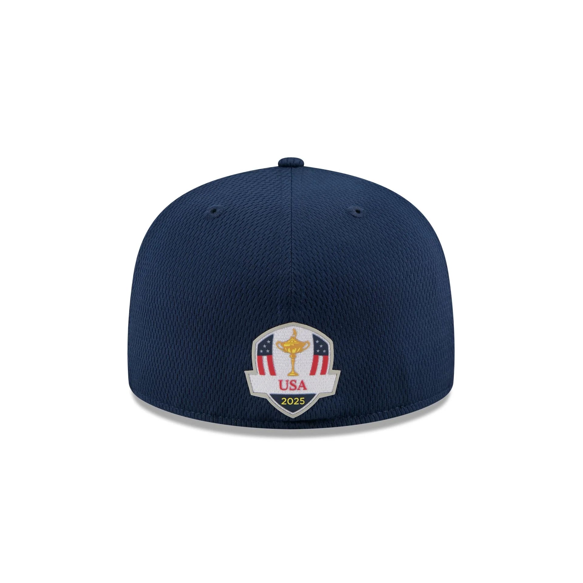The 2025 Ryder Cup Team USA Flag 59FIFTY A-Frame Fitted Cap features a silicone Team USA Flag at the front panels with a Ryder Cup logo at the rear. Additional details include embroidered stars at the right-wear side, a rope at the visor, and a gray undervisor.