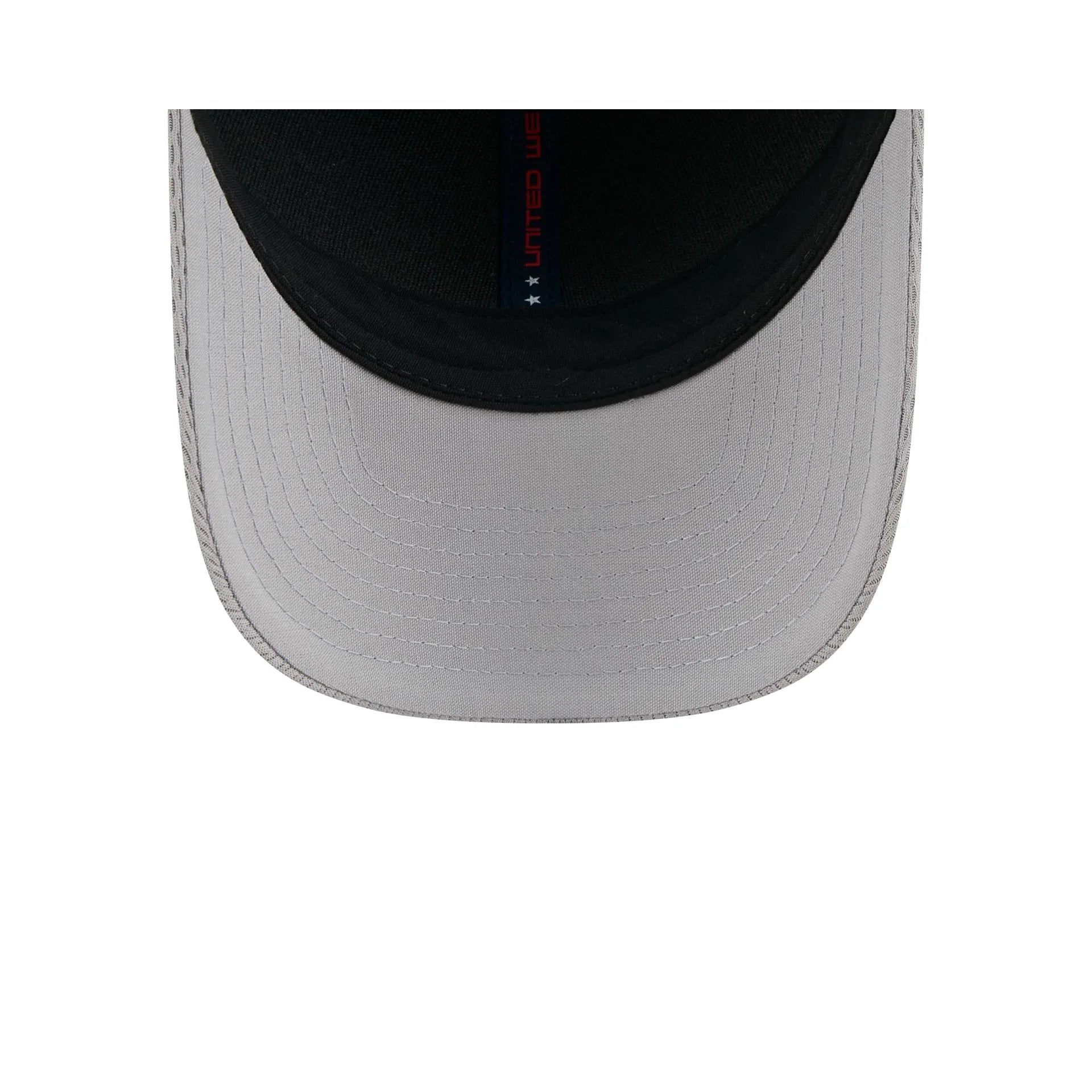 The 2025 Ryder Cup Team USA Gray 9FORTY M-Crown Snapback features an embroidered Team USA logo at the front panels with a silicone Ryder Cup logo above an adjustable snapback closure at the rear. Additional details include a U.S.A. pin at the front left panel and a gray undervisor.