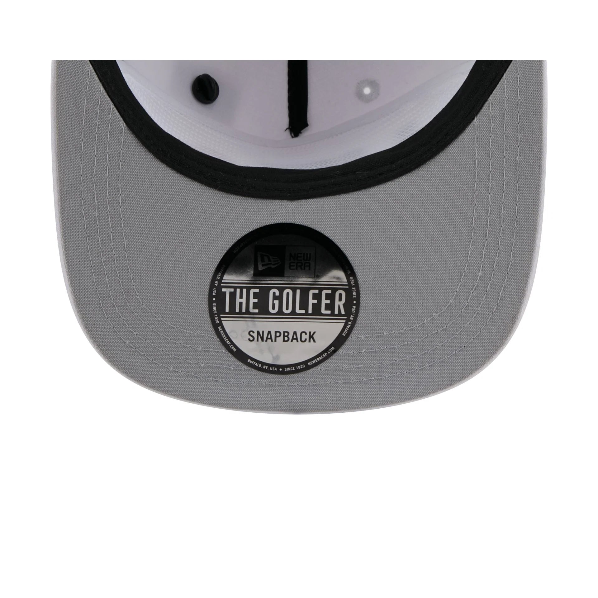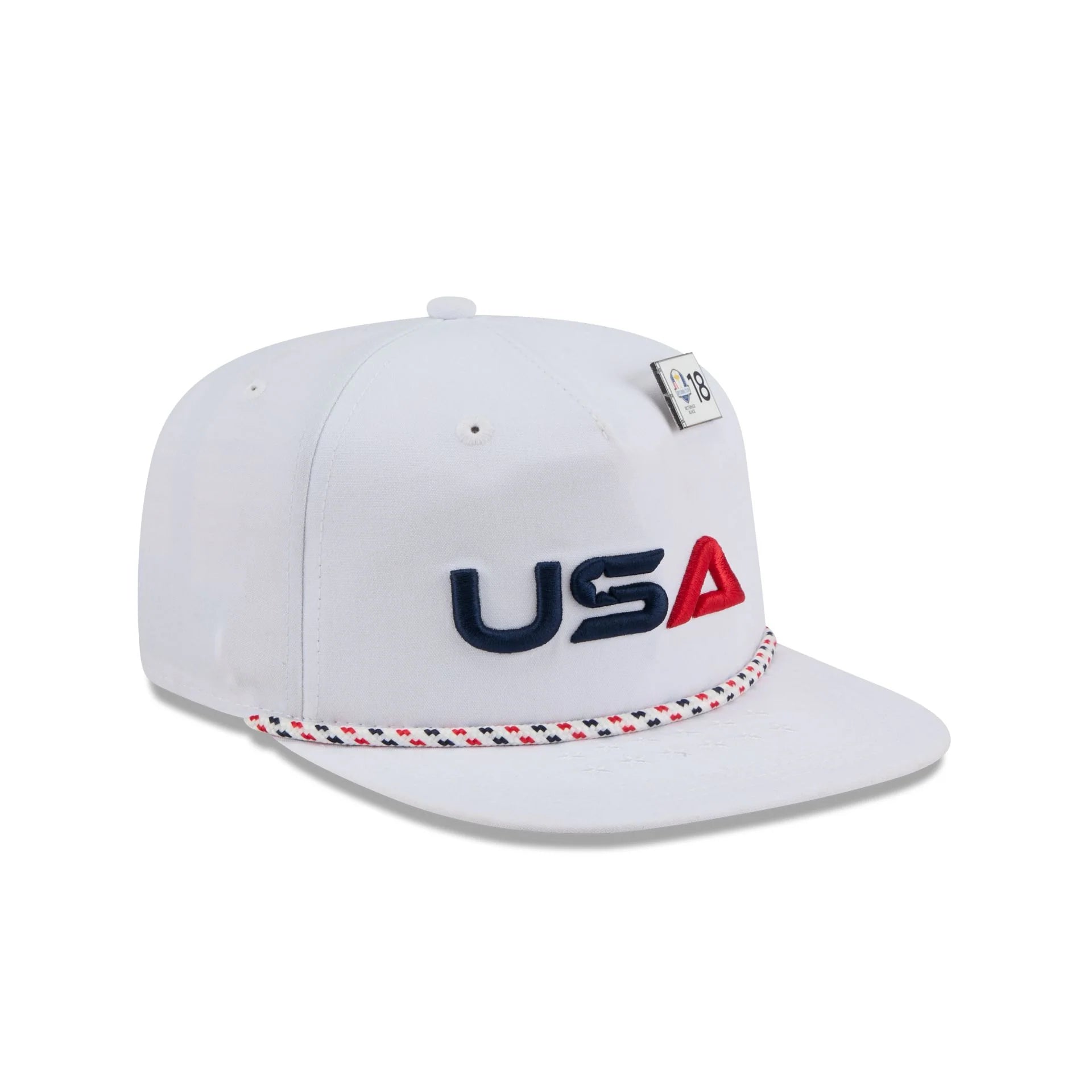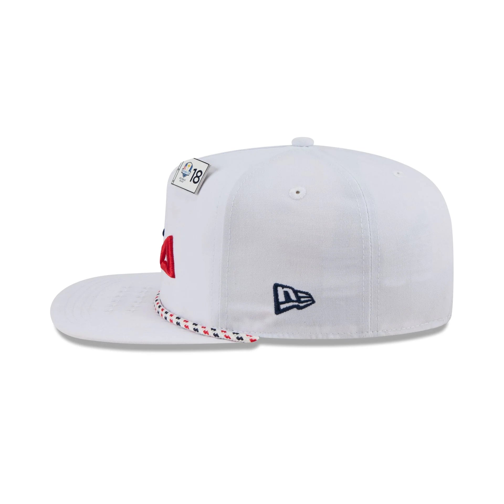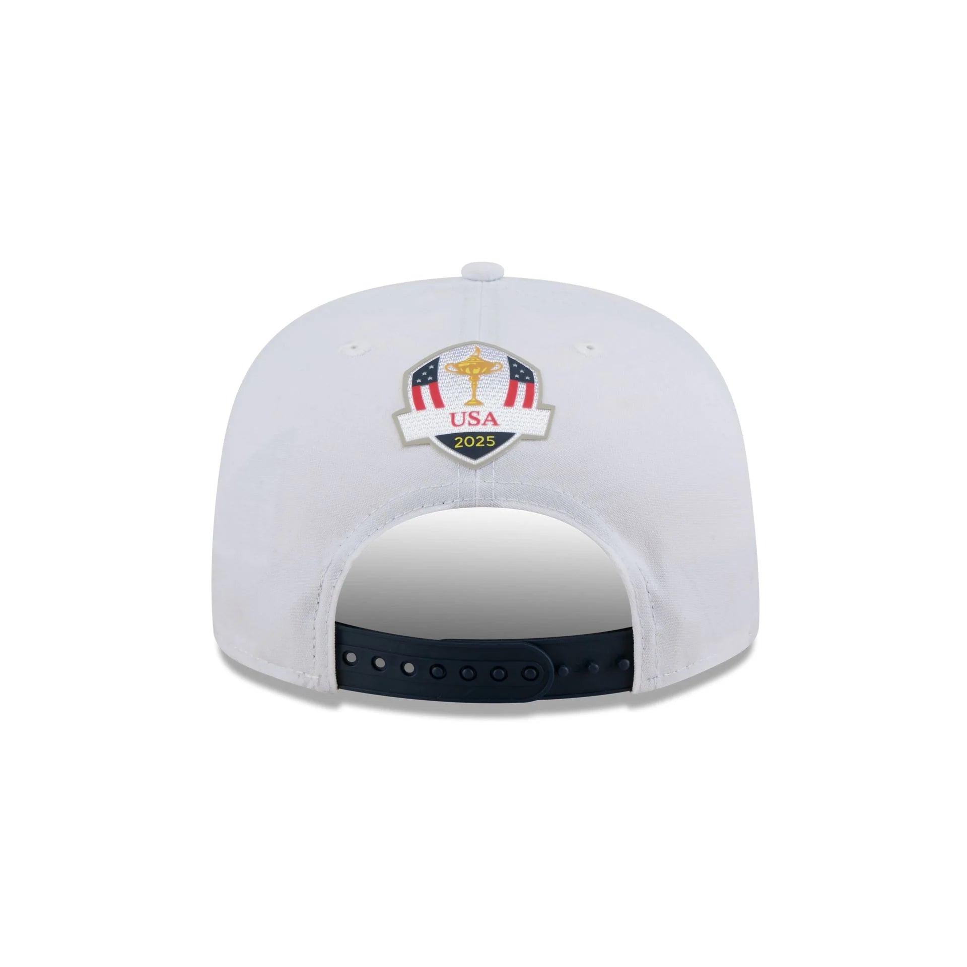 The 2025 Ryder Cup Team USA White Golfer features an embroidered Team USA logo at the front panels with a silicone Ryder Cup logo above an adjustable snapback closure at the rear. Additional details include Ryder Cup pin flag at the front left panel, a rope at the visor, and a gray undervisor.