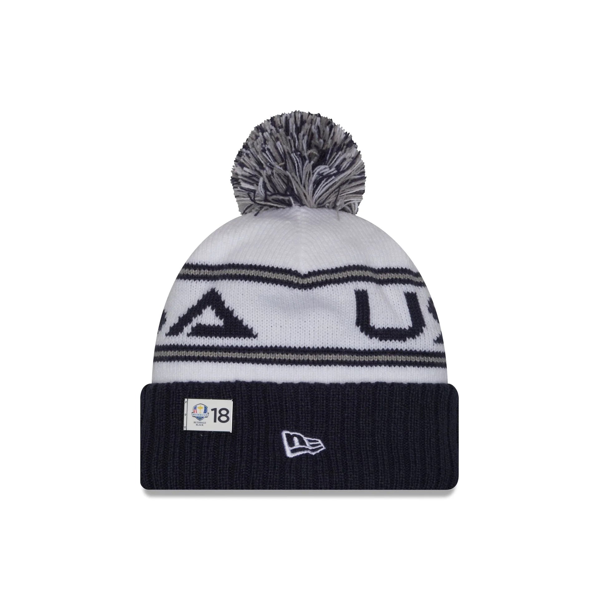The 2025 Ryder Cup Team USA White Pom Knit features a silicone Team USA logo at the front cuff with the 18 hole pin flag to the left and a one-time removable pom.