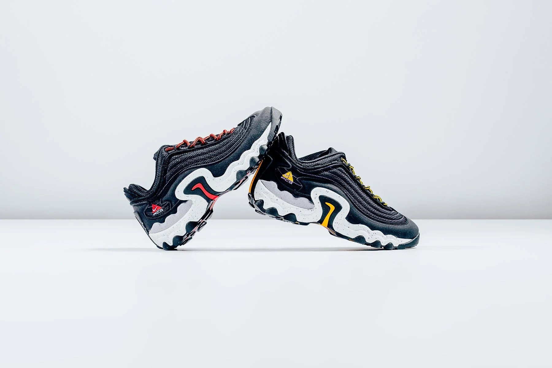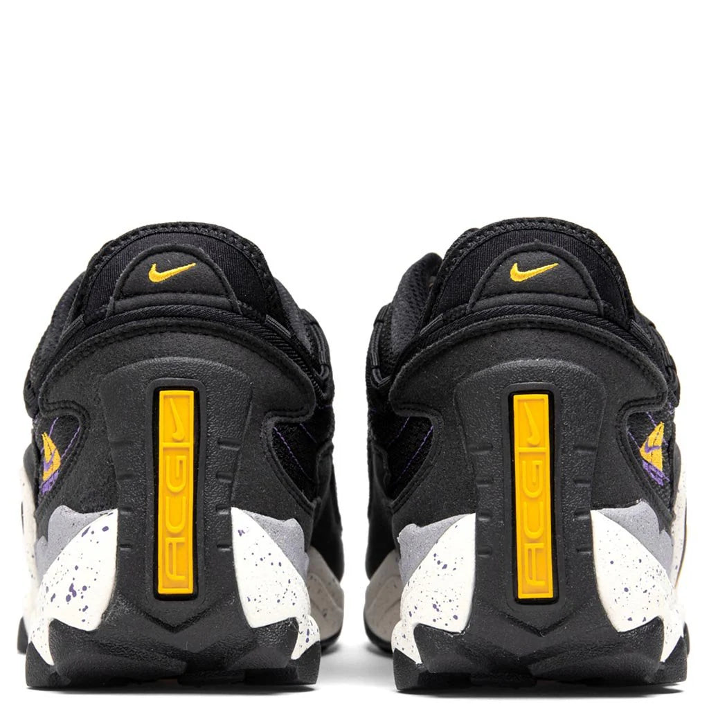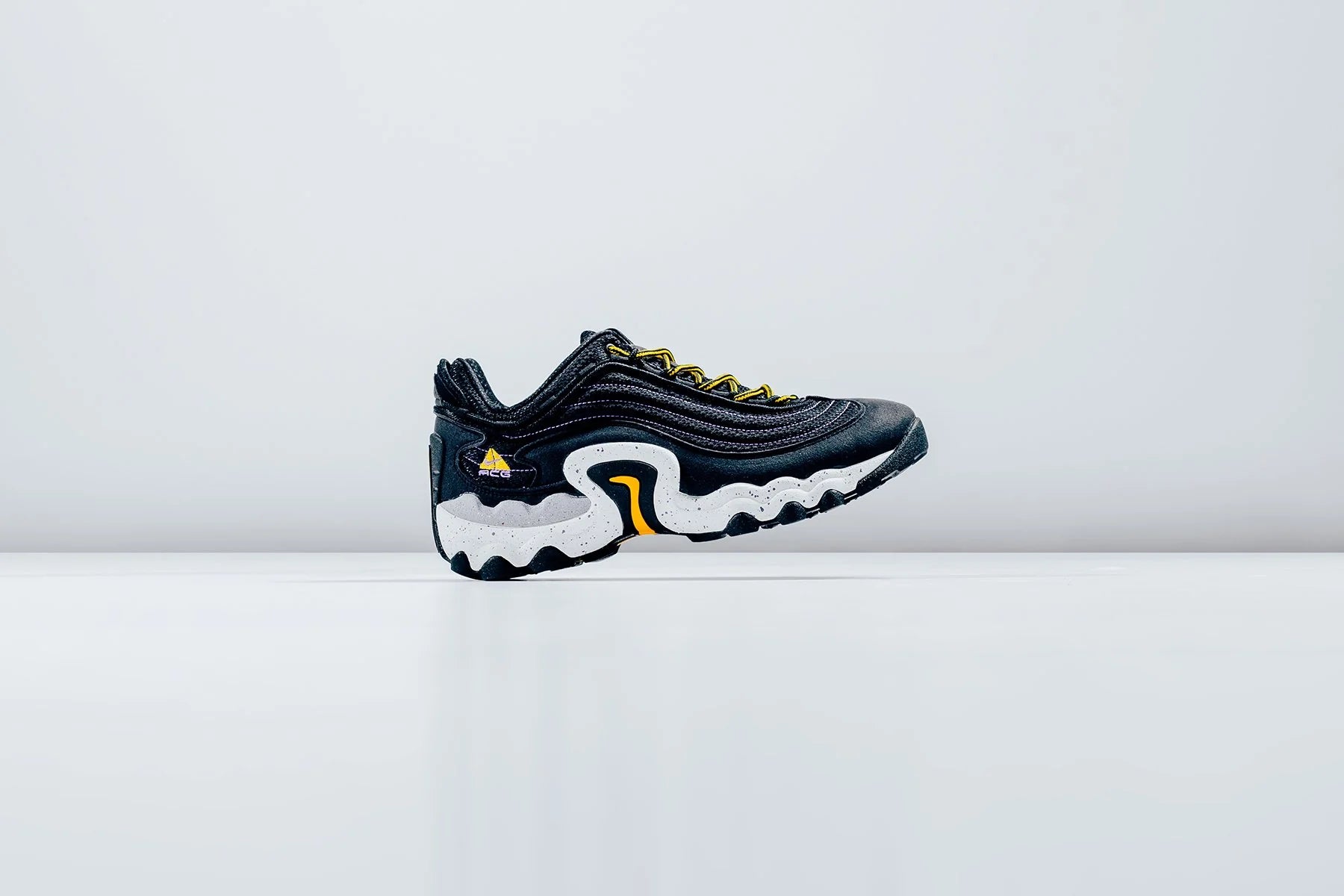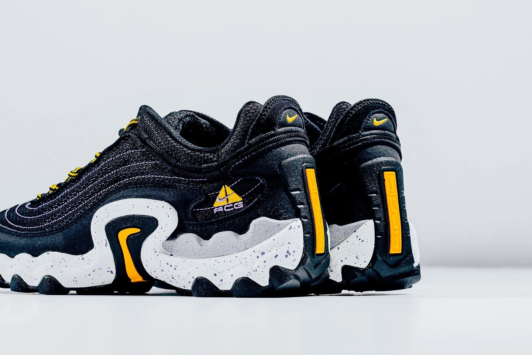 Nike's infamous ACG category retros mid 1990s Air Skarn silhouette. Often looked past because of other popular ACG sneakers from this era, the Air Skarn was ahead of its time. Made from recycled materials this model boasts a thick midsole to match rope style overlays. This colorful iteration features ACG branded details located on the heel as well as black rubber midsole finish. Pictured is the Nike ACG Air Skarn Sneaker in Black/University Gold.