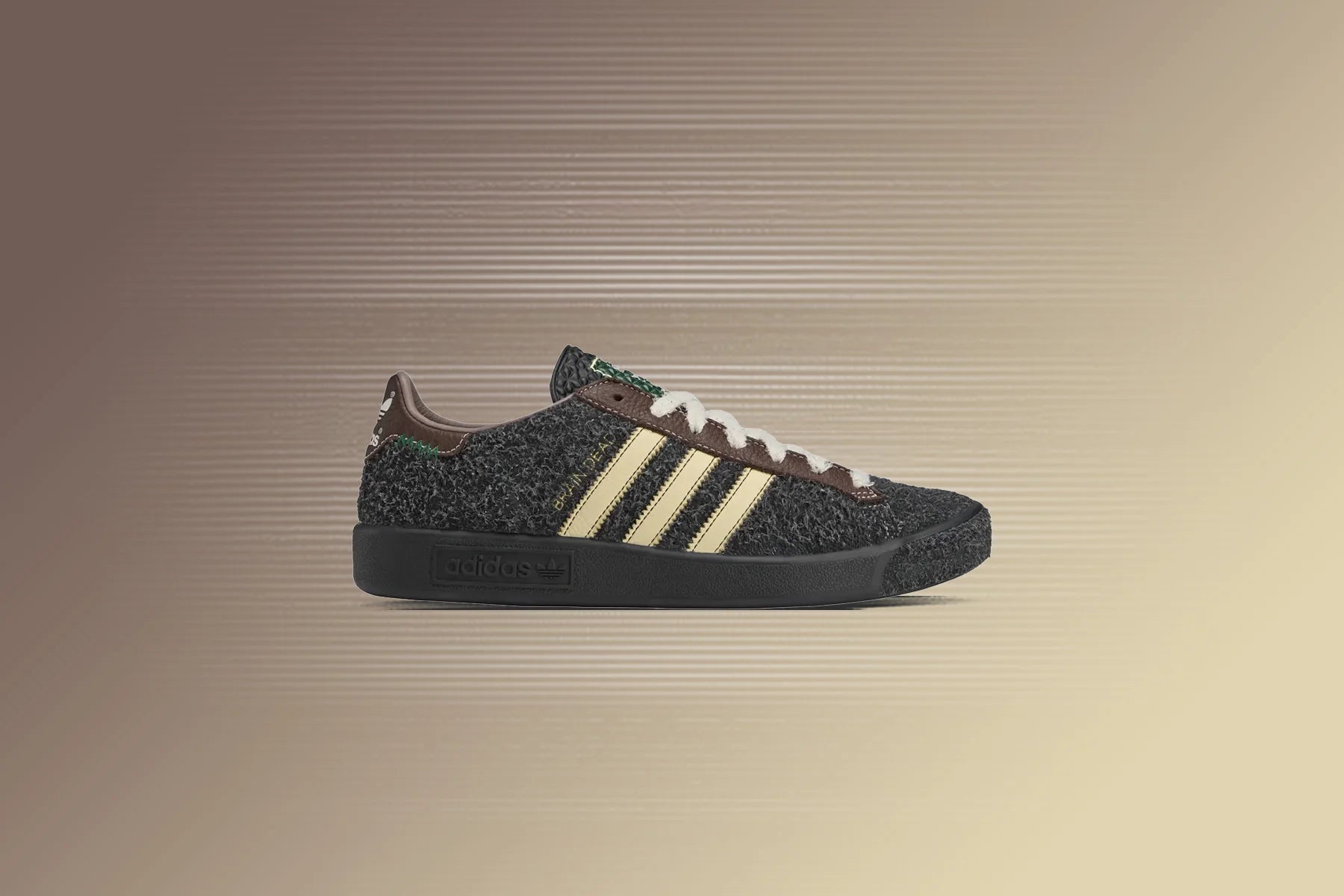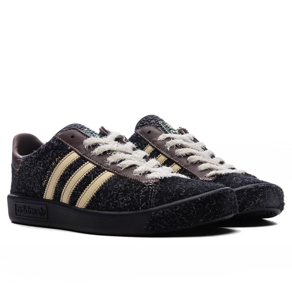 The Adidas x Brain Dead Forest Hills reimagines the classic silhouette with a black shaggy suede upper, delivering a bold, textured look. Off-white leather stripes, laces, and lining add a vintage contrast, while metallic gold 'Brain Dead' branding offers a fresh update. Brown accents on the heel and lace guards bring depth to the design, complemented by green details on the tongue and insoles. A sleek Core Black sole rounds out the look with a modern edge.