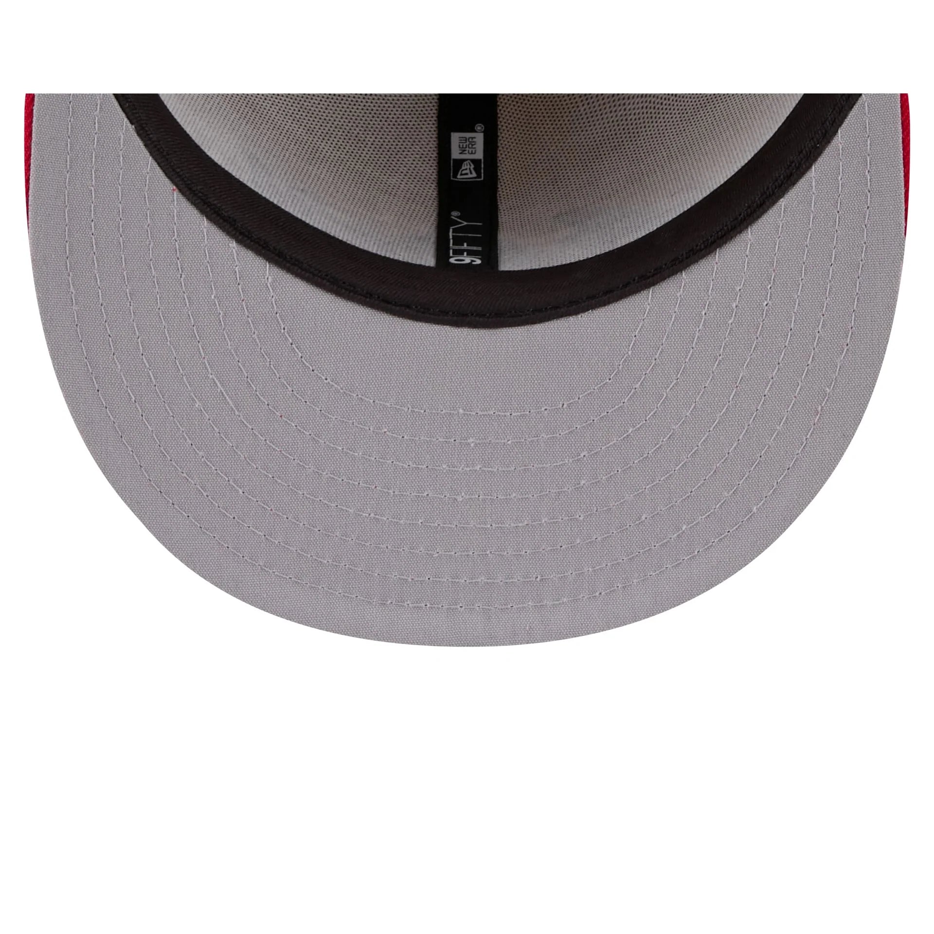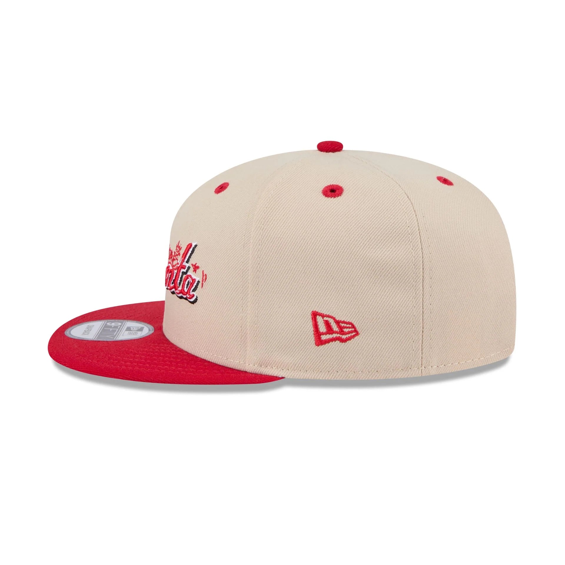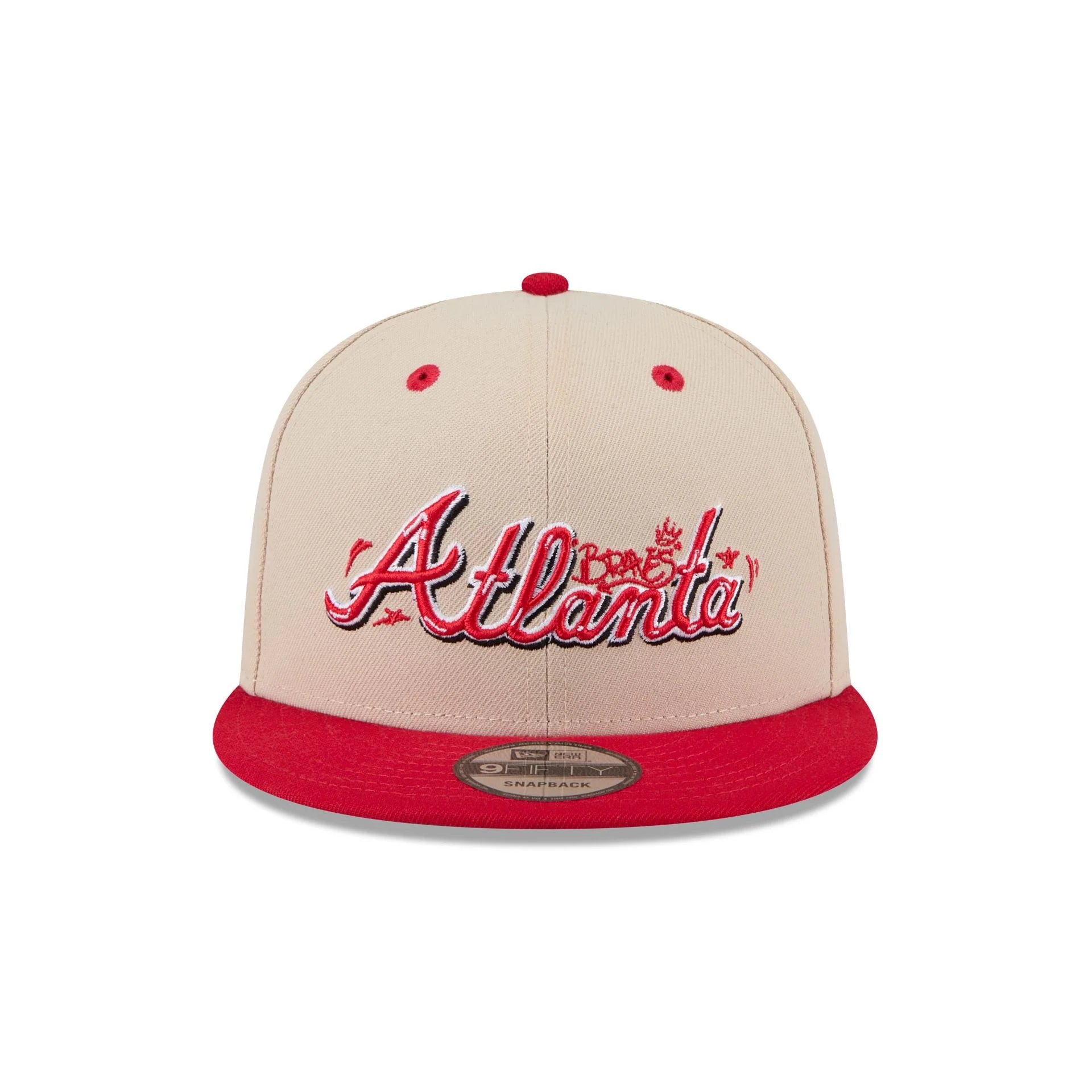 The Atlanta Braves Team Art 9FIFTY Snapback features an embroidered Braves wordmark at the front panels with art. Additional details include a team wordmark above a snapback closure at the rear and a gray undervisor.