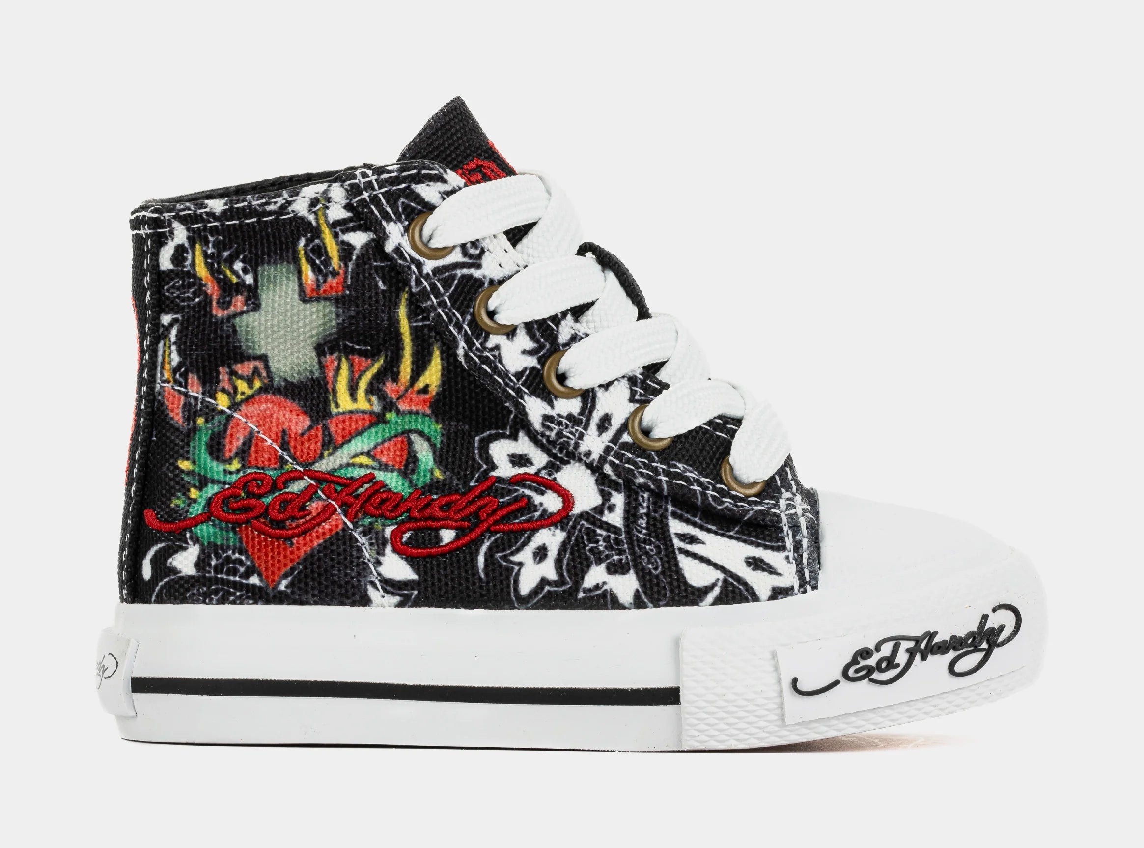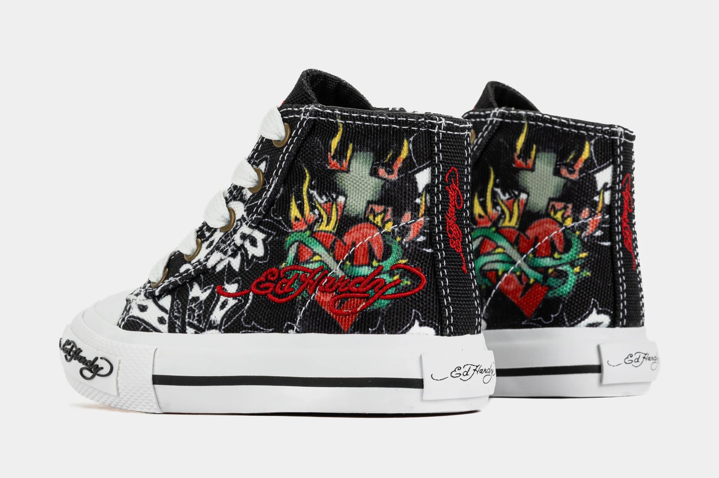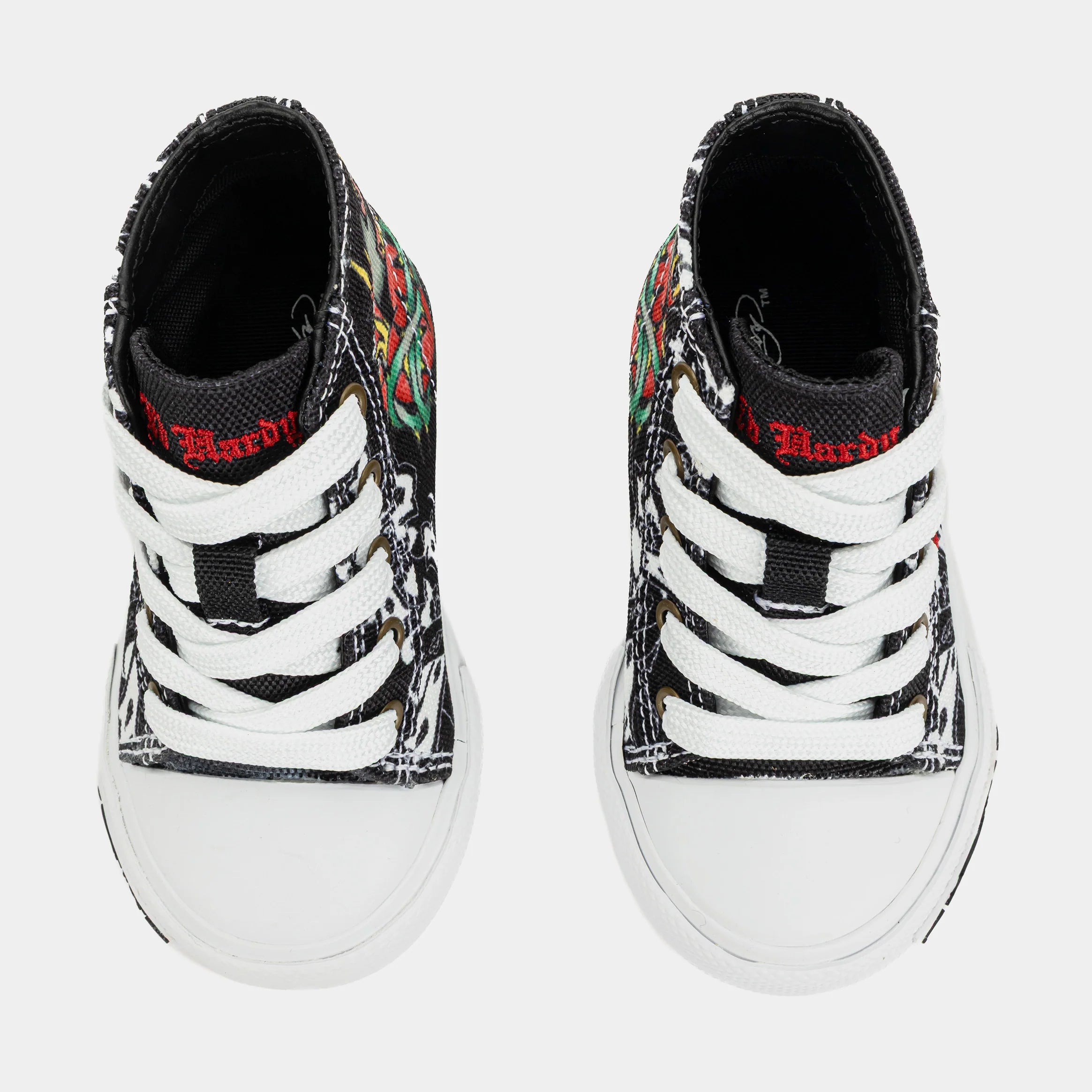 Turn heads with these bold Ed Hardy High Top Sneakers featuring an all-over tattoo-inspired graphic design. The classic canvas upper is covered in vibrant artwork with shades of red, green, and black, delivering the brand’s signature rebellious edge. Finished with contrast white laces, a durable rubber sole, and Ed Hardy branding on the toe, these sneakers combine streetwear style with everyday comfort.