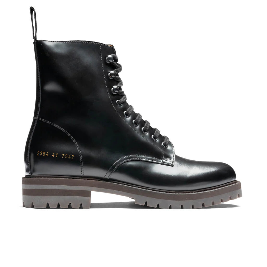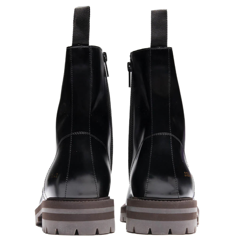 The Common Projects Combat Boot makes an elevated impression on any footwear rotation. Taking on a leather upper, this classic boot silhouette includes a side zip closure and heel pull tab. A stamped series number is stamped at the heel. A rubber lug outsole finishes the design.