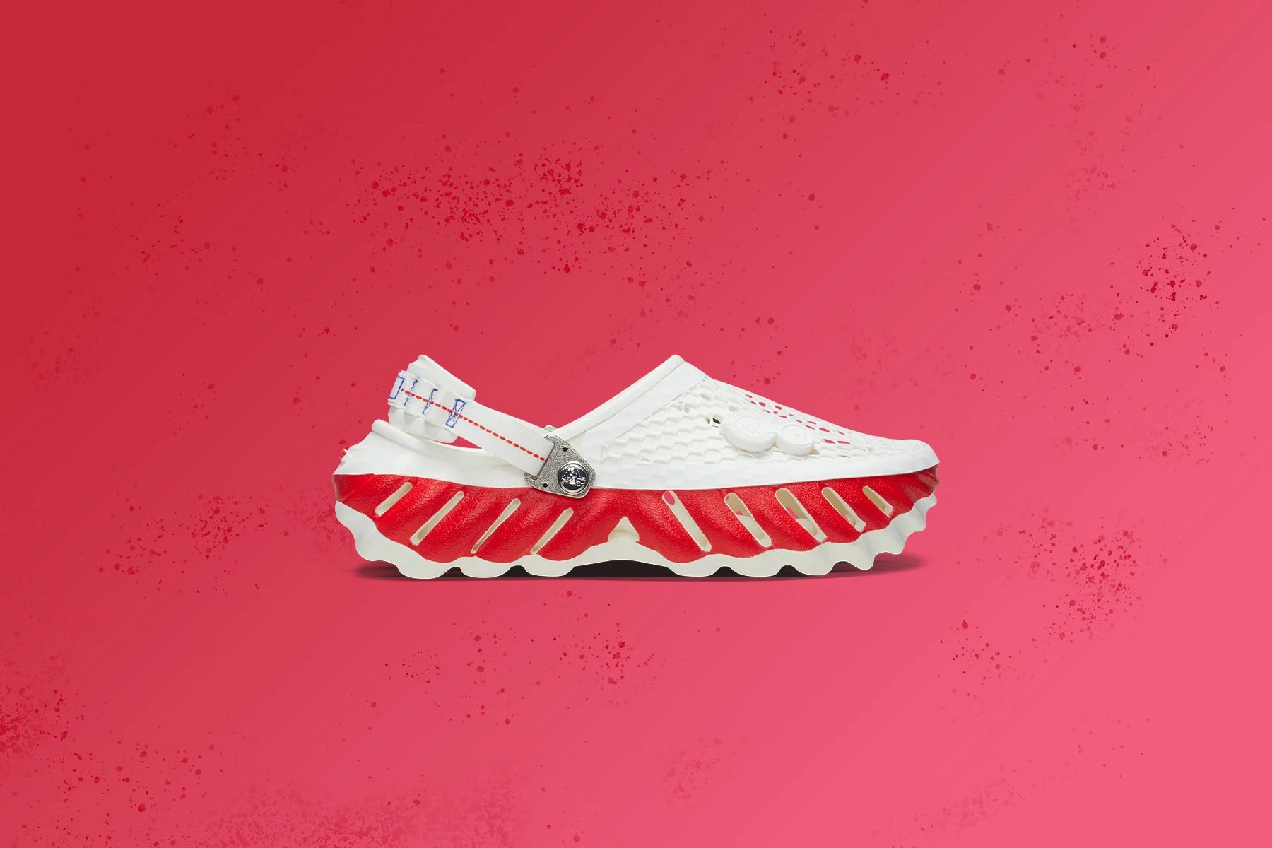 South Korean-based fashion label Kanghyuk partners with Crocs to bring their own vibe to the Classic Clog. Crafted with signature Croslite and an airbag design, these stand out with Kanghyuk-themed Jibbitz and bold red stitching. The ventilation ports and buoyant feel add a fresh look. An adjustable Kanghyuk-branded heel strap and treaded outsole complete this design.