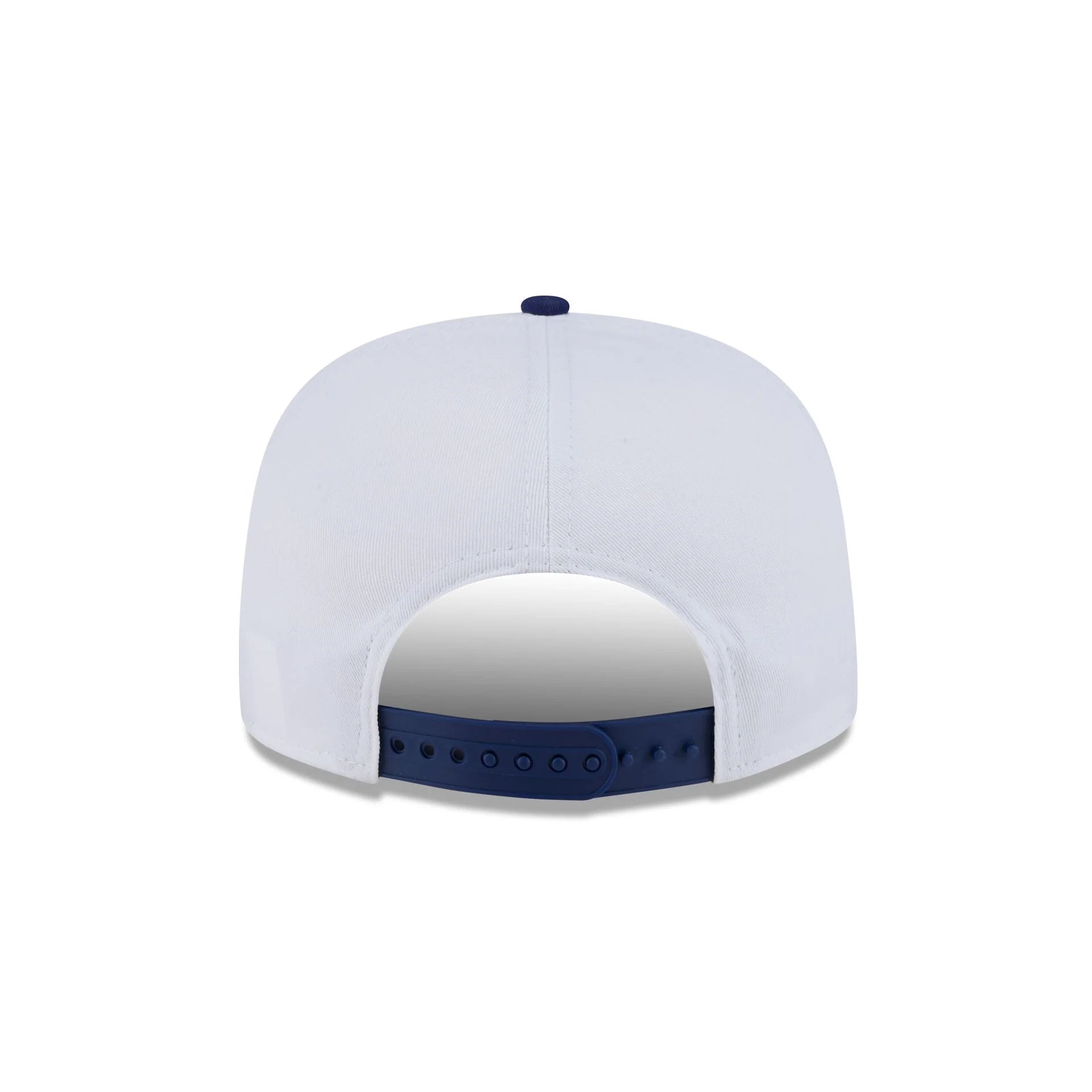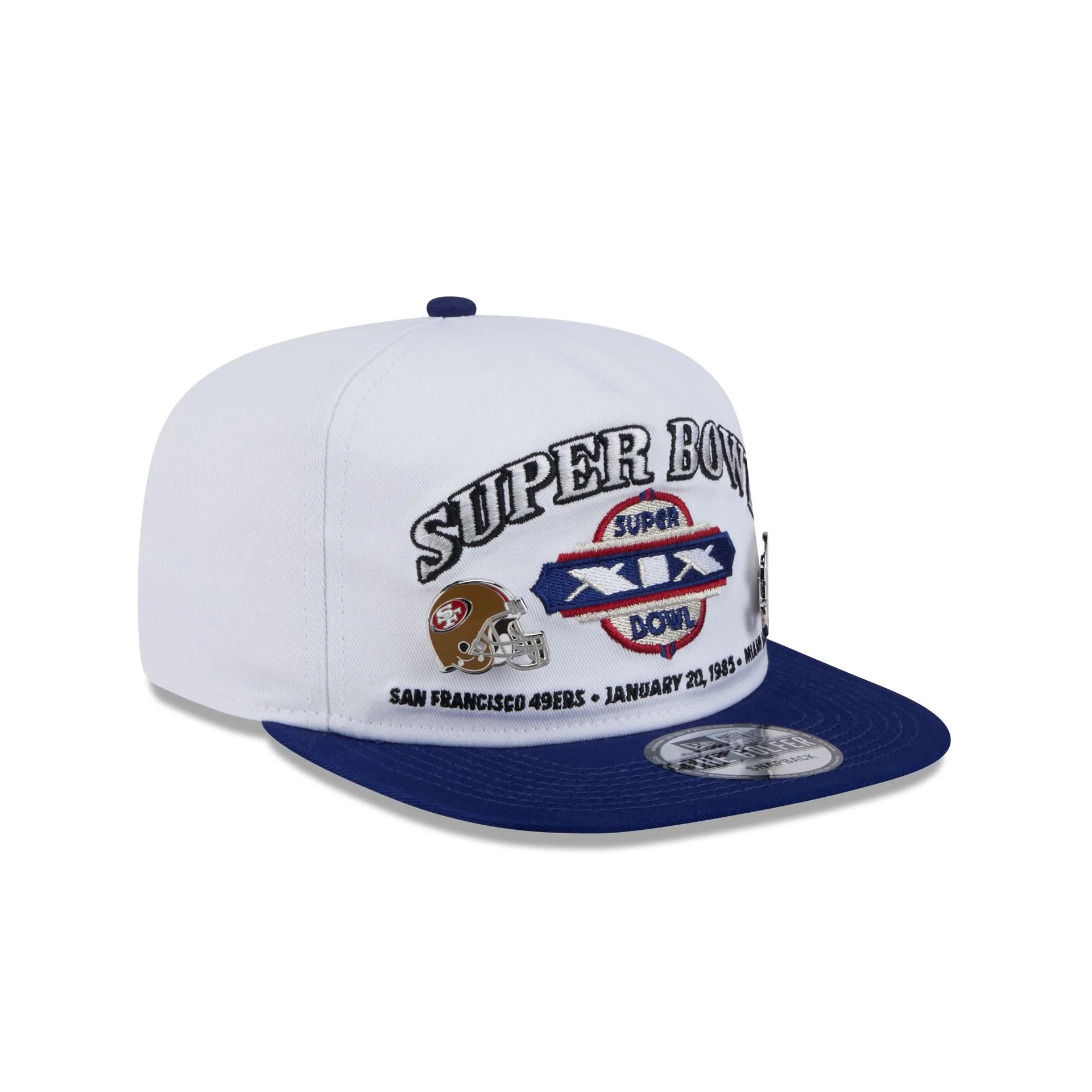 The NFL Super Bowl XIX Championship Pin Golfer features an embroidered Super Bowl XIX patch with dueling San Francisco 49ers and Miami Dolphins pins and team wordmarks at the front panels. Additional details include a navy visor with green undervisor and an adjustable snapback closure at the rear.