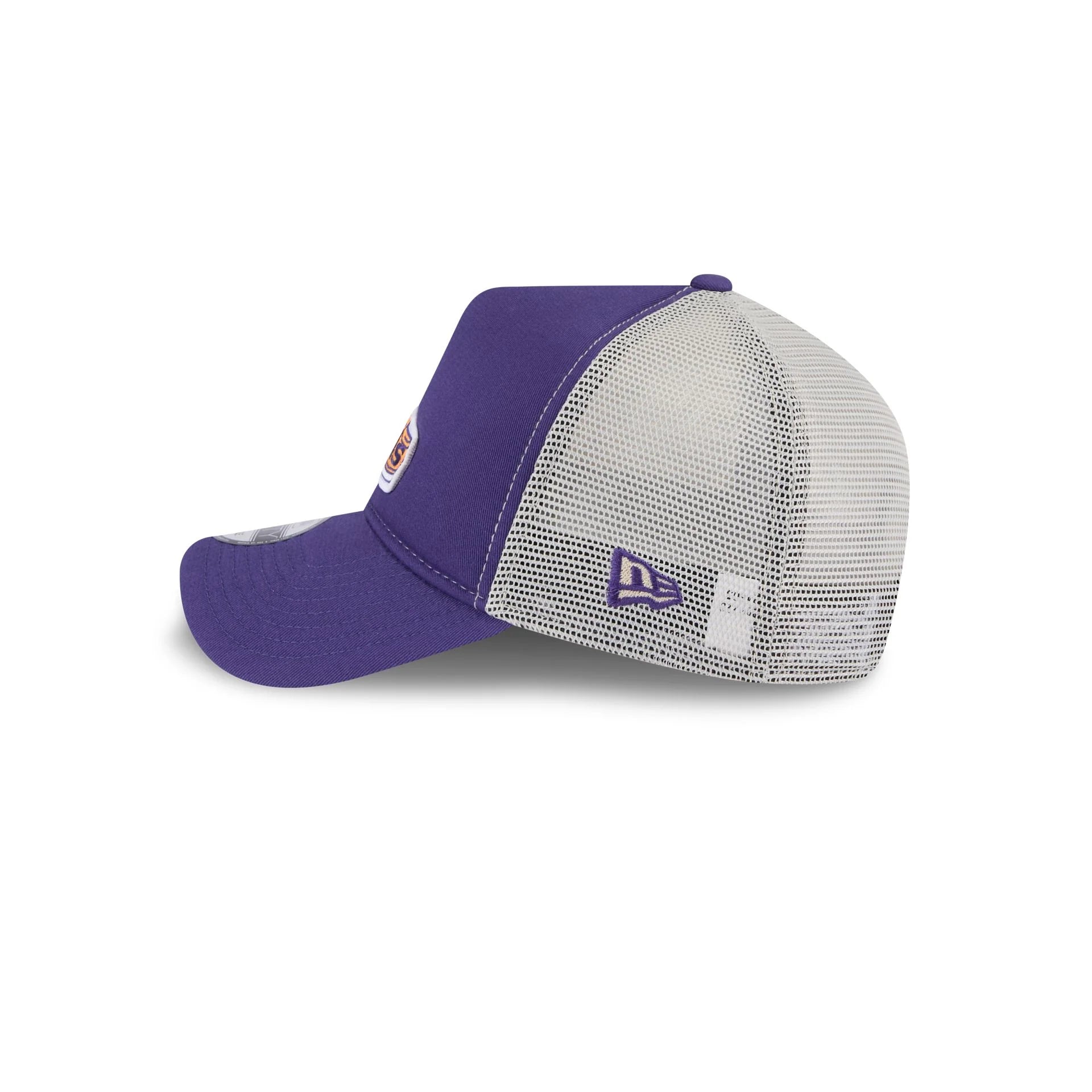 The Phoenix Suns 2025 All-Star Game Fan Pack 9FORTY A-Frame Trucker features an embroidered Suns sneaker logo at the front panels with a mesh back and a snapback closure at the rear.
