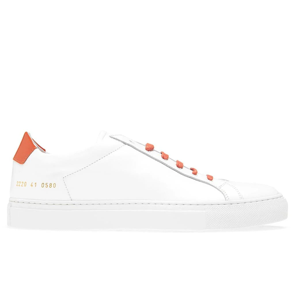 Founded by Prathan Poopat and Flavio Girolami in 2004, Common Projects are best known for their signature gold stamp at the heel highlighting style and size. Assembled in Italy using the highest-quality materials, Common Projects pushes the standard in luxury footwear. Pictured is the Common Projects Retro Low Glossy in White/Orange.