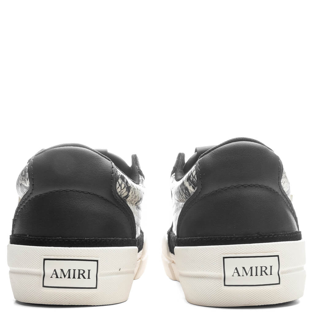 The Snake Sunset Skate Low in Black features a striking combination of matte and snake-embossed leather, highlighted by a layered star detail on the side. The design includes a flat heel, round toe, and lace-up vamp for a classic skate silhouette. Logos on the tongue and heel, along with a padded collar, add both style and comfort, while the durable rubber outsole ensures lasting wear.
