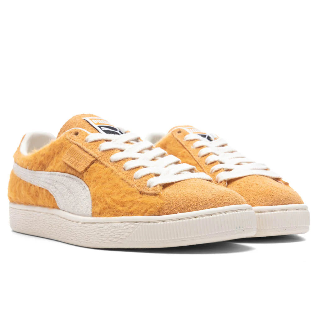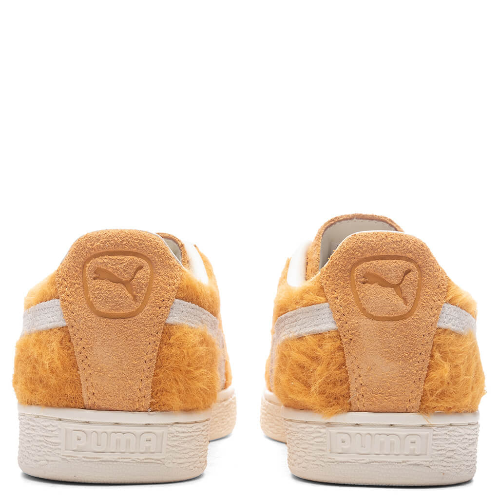PUMA's Suede Mohair in Brown features a blend of leather and textile for a stylish upper. The hairy suede vamp, heel, and tongue add a unique texture, while the breathable synthetic collar enhances comfort. Equipped with a SOFTFOAM+ sockliner for cushioning, a rubber midsole for support, and a durable rubber outsole for traction, these sneakers combine both style and functionality. The hairy suede PUMA Formstrip completes the look, making them a standout choice for any outfit.