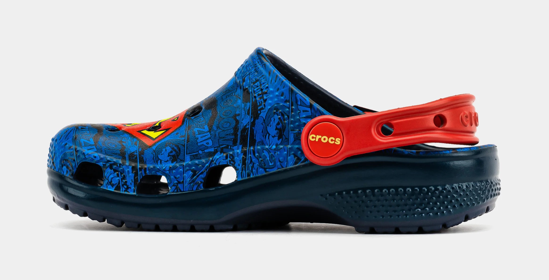 The Superman collection has landed. And the classic Super Hero inspired this Classic Clog. An allover comic book print serves as the background. But the real hero of the design is the Superman S-shield on the upper and rivets. It’s style with a capital “S”.