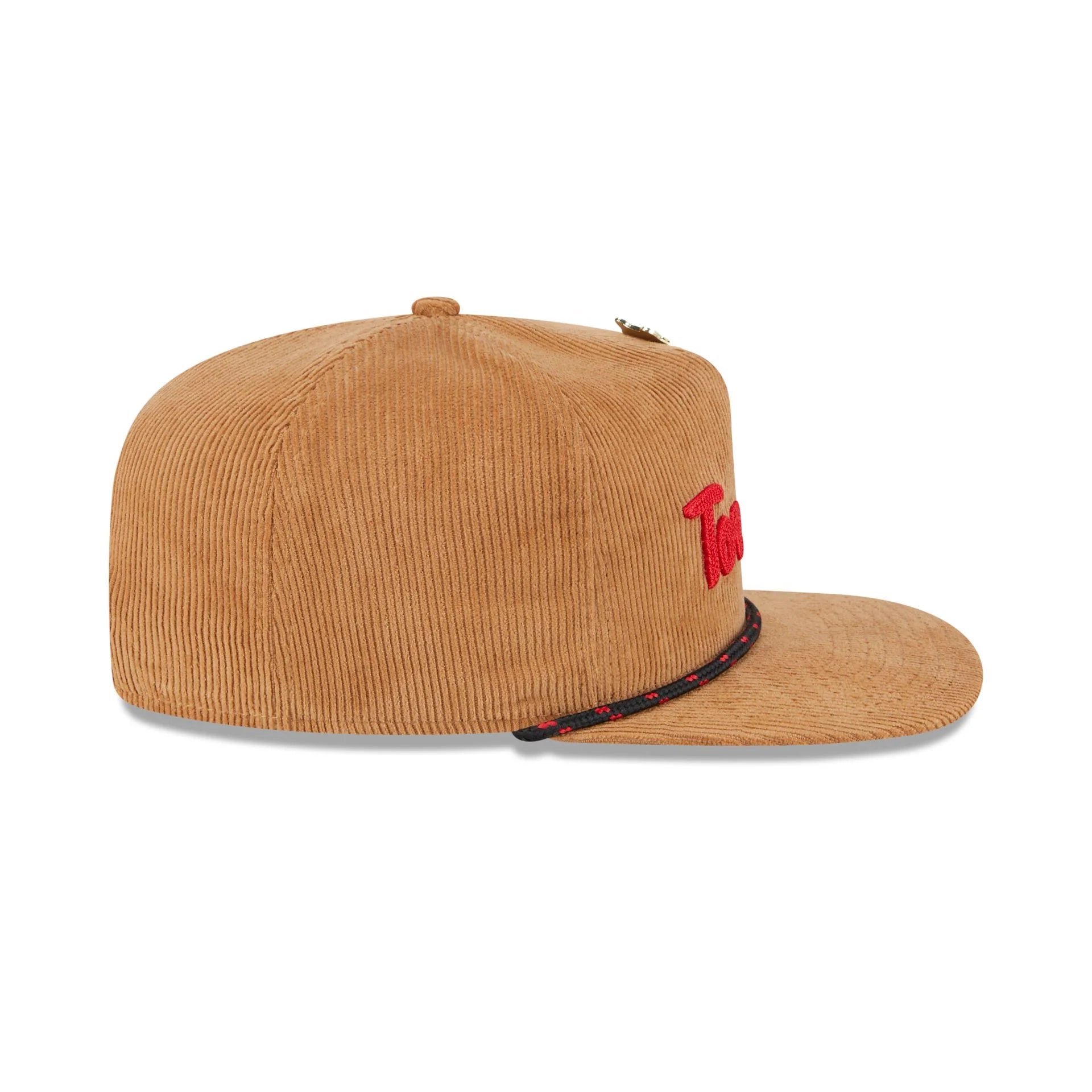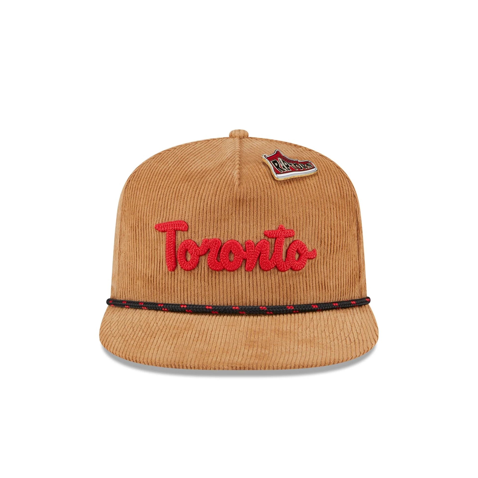 The Toronto Raptors 2025 All-Star Game Fan Pack Corduroy Golfer features an embroidered Raptors script wordmark and sneaker pin at the front panels against a corduroy fabrication. Additional details include a rope at the visor, a team tag on a snapback closure at the rear, and a camo undervisor.